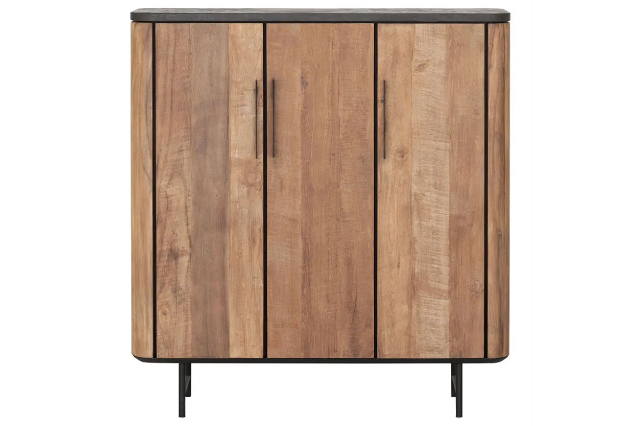 Bringen Sie mit unserem Schrank im Industrial-Stil aus recyceltem Teakholz und schwarzen Mortex-Details zeitlose Eleganz und modernes Design in Ihr Zuhause und schaffen Sie einen Raum, der zum Verweilen und Entdecken einlädt. Hergestellt aus recyceltem Teakholz in Naturfarbe, strahlt der Korpus des Schranks rustikalen Charme und natürliche Schönheit aus. Jedes Stück Holz erzählt seine eigene Geschichte und verleiht dem Schrank eine einzigartige Ausstrahlung.