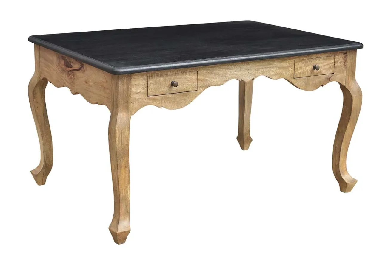 Obwohl der Tisch nach französischem Stil aussieht, wurde er aus dem exotischen Mangoholz gefertigt und steht so im Kontrast zwischen Aussehen und Material. Der Bürotisch mit den Maßen Breite 140cm, Höhe 78cm und Tiefe 90cm hat eine Stärke von 2,5cm. Die Oberfläche wurde dunkelgrau gebeizt und lackiert, so dass sie schwarz erscheint und es den Anschein macht, als wäre die Platte aus einem komplett anderen Material als das restliche Gestell, aber dem ist nicht so. Letzteres wurde in seiner Naturfarbe belassen. Die Beine, welche 4 an der Zahl sind, sind elegant nach außen geschwungen, genau wie die untere Kante, durch die der französische Charme zustande kommt. Der mögliche Computertisch hat sogar zwei kleinere Schublädchen, in denen sich Gegenstände wie Notizblöcke und Stifte problemlos verstauen lassen. Das Produkt passt super in kleinere Büros, aber auch in Wohnzimmer mit einer freien Ecke zum Arbeiten.
