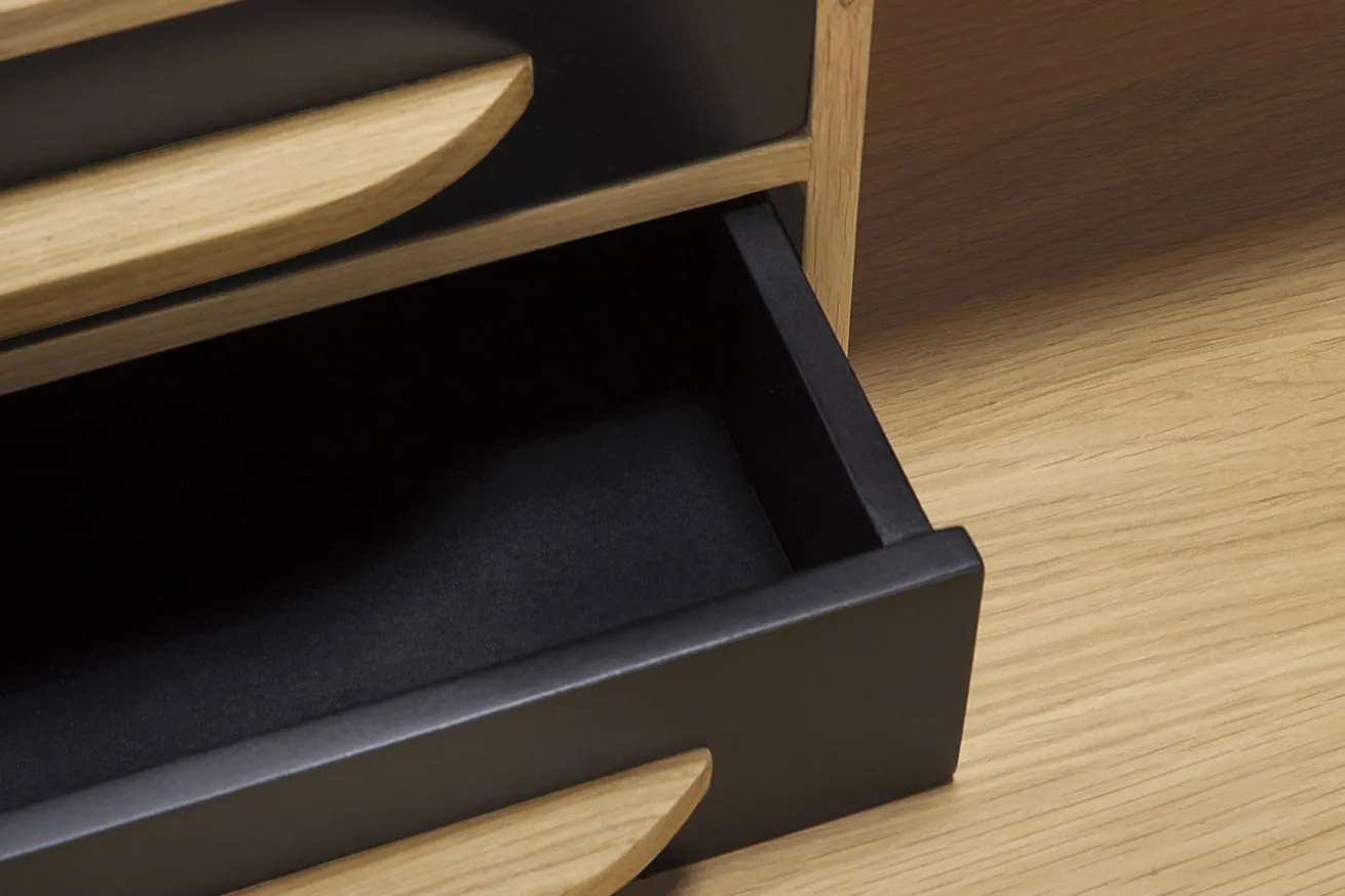 Mit dem Schreibtisch Origami holen Sie sich den Retro-Look der 60-er Jahre in Ihre 4 Wände. Egal ob Zuhause oder im Büro, dieser Schreibtisch aus Eiche Massivholz ist der absolute Hingucker. Die 5 Schubladen bieten genügend Stauraum für Ihre Unterlagen und Schreibutensilien und passen dank der schwarzen Farbe zum natürlichen Look des Massivholztisches. Er eignet sich auch als Computertisch, aber vor allem als Bürotisch im Home Office. Das Eichenholz hält jedem Ihrer Arbeitsstunden stand.