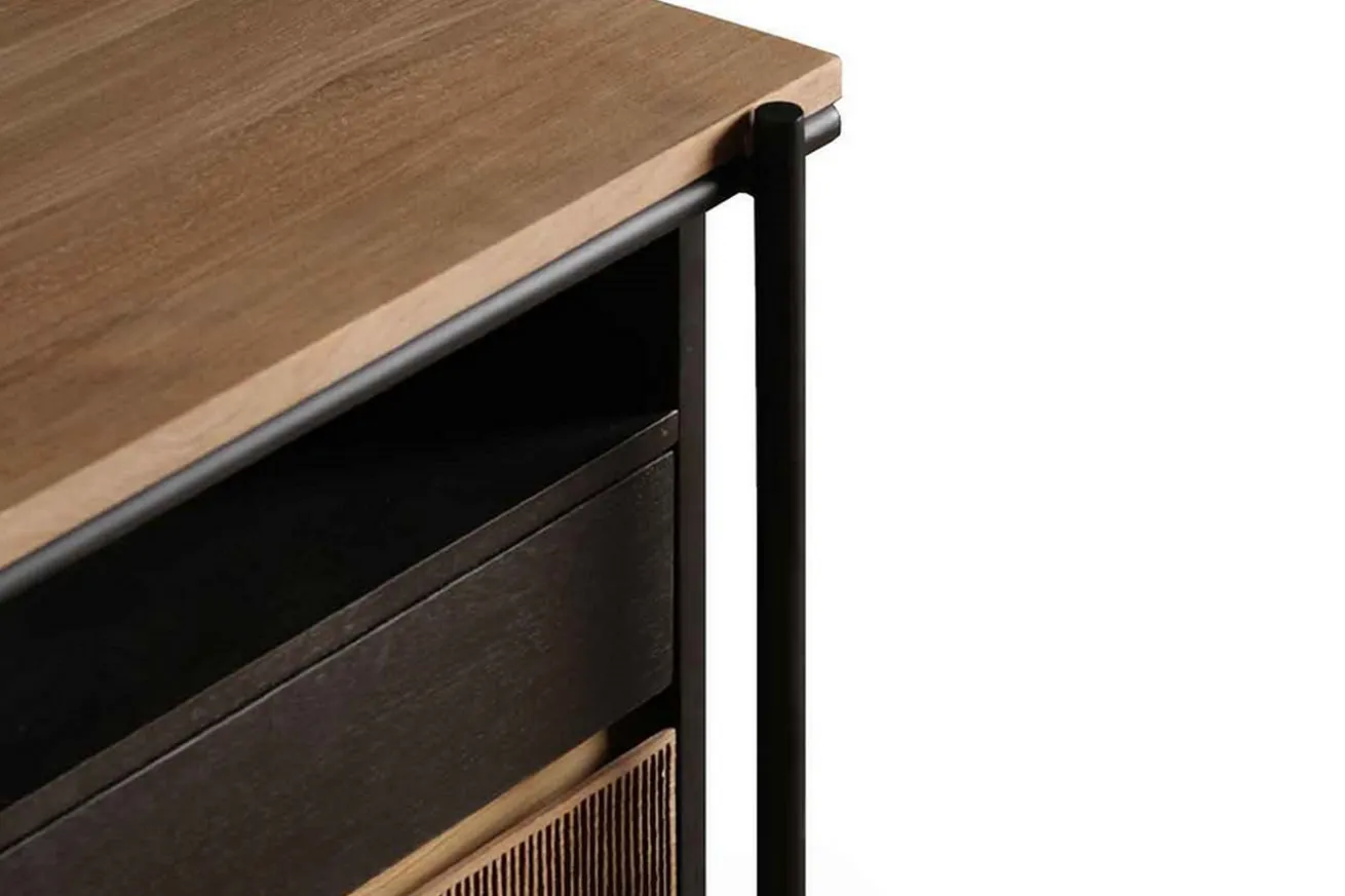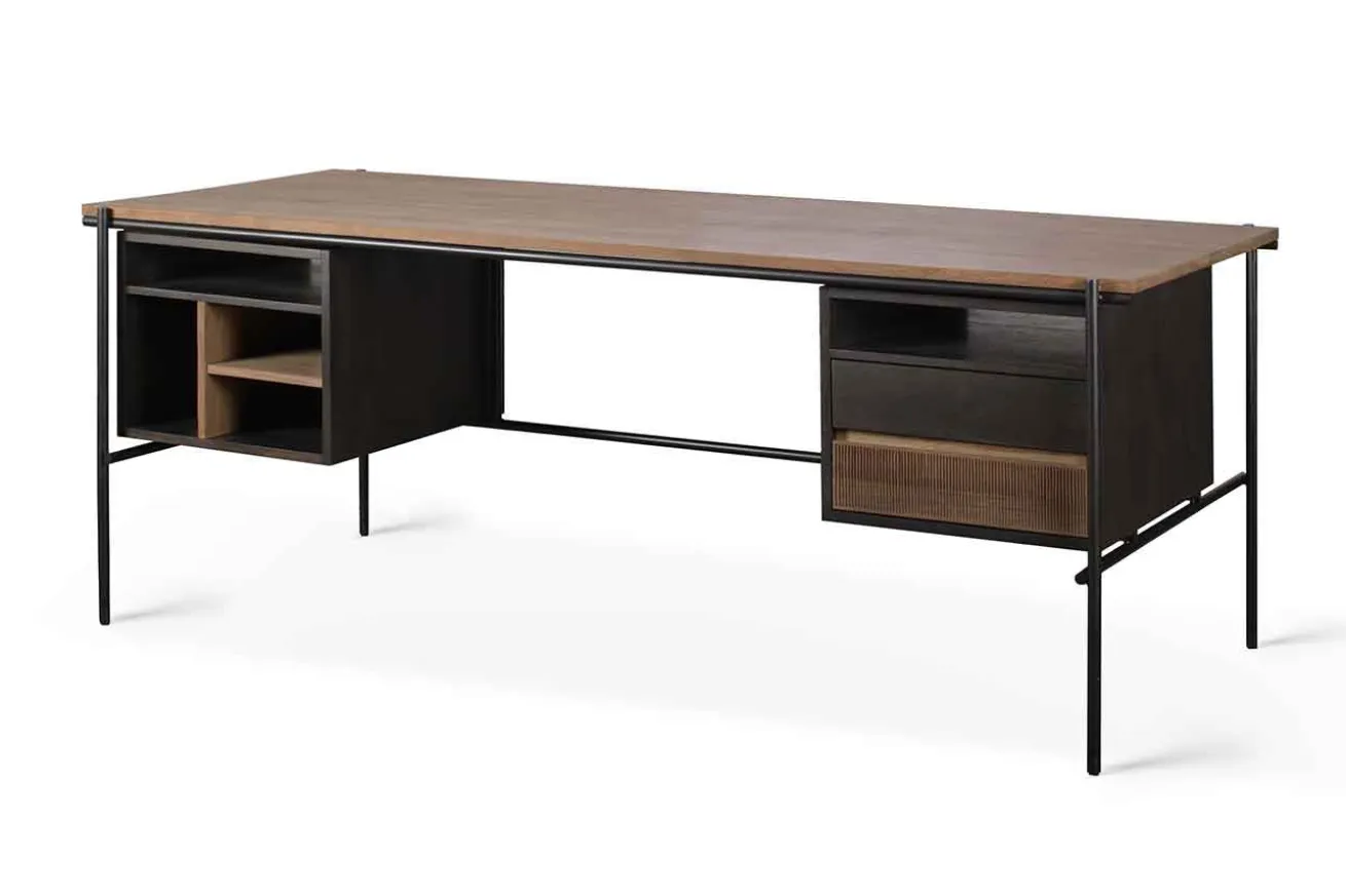 Ob minimalistisches Aussehen oder mehr Platz und Stauraum. Mit diesem Schreibtisch mit einer Massivholz Eiche Platte erfüllen Sie sich mehrere Optionen gleichzeitig. Das Büromöbel hat im Gesamten eine Breite von 200cm, eine Tiefe von 90cm sowie eine Höhe von 76cm. Es besteht aus naturfarbenem Teakholz und einem schwarzen Metallgestell. Der dadurch entstandene Skandi-Look kann mit einem im selben Stil gefertigten Schreibtischstuhl kombiniert werden. Der Oscar-Schreibtisch ist mit oder ohne Schubladen erhältlich. Entworfen von Alain van Havre.