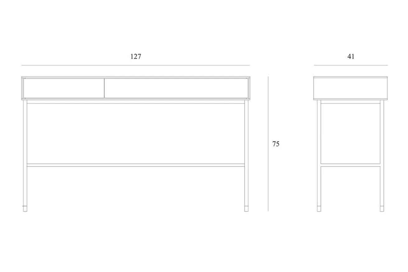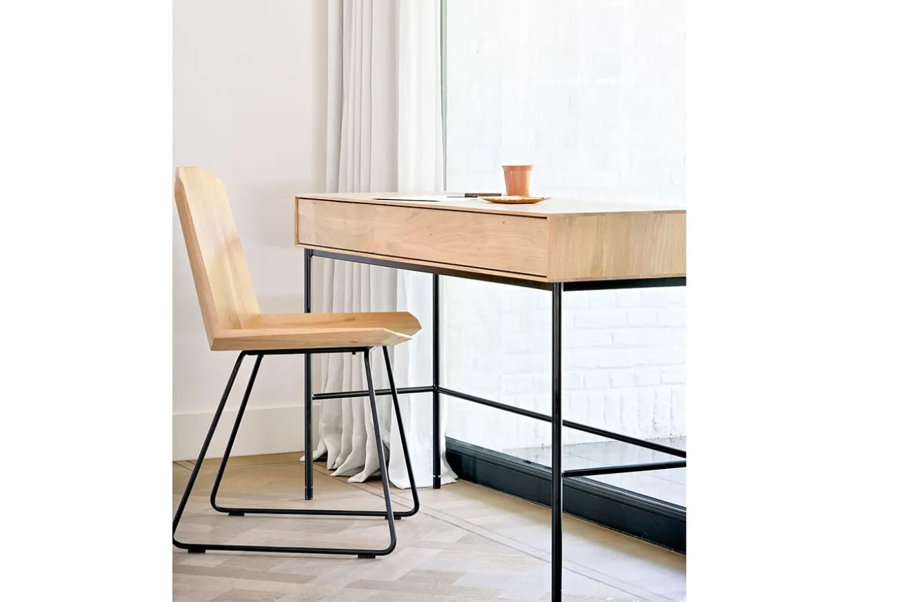 Klein, praktisch, gut. Dieser Schreibtisch findet auch in der kleinsten Ecke seinen Platz. Denn mit einer Breite von 127cm, einer Höhe von 77cm und einer Tiefe von 41cm fällt er relativ schmal aus. Der aus massivem Eichenholz bestehende Korpus wird von einem schwarzen, feinen Stahlgestell getragen. In der breiten Schublade ist genügend Stauraum für Ihre Unterlagen und Schreibuntensilien.