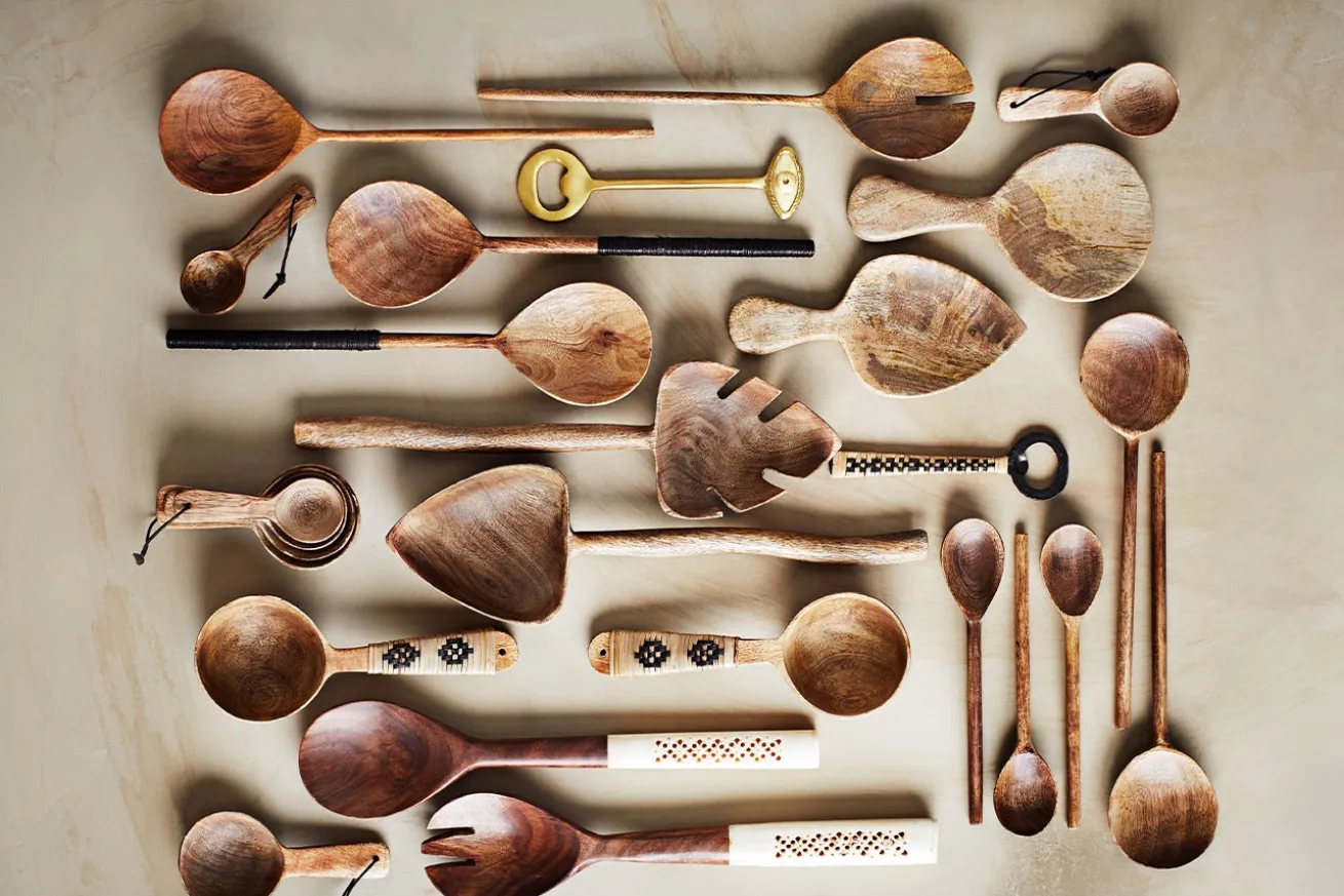 Mit dem naturfarbenen Holzlöffel aus Mangoholz lassen sich nicht nur Suppen schöpfen, sondern auch Reis als Hügel auftischen. Mit einer Breite von 18cm, einer Tiefe von 7cm und einer Höhe von 2cm ist er immerhin groß genug dafür. Der natürliche, helle Braunton wird mit noch hellerem Bambus, welches den Griff ummantelt, zusammengeführt und sorgt so für ein noch natürlicheres Aussehen. Das darauf gefertigte schwarze Muster ist ein stilvolles Detail, das zu Küchen im Boho-Stil passt. Dank des Lederbands, welches sich am Ende des Griffs befindet, lässt sich der Servierlöffel problemlos in der Küche an einen Nagel hängen. So ist es immer griffbereit, wenn Sie kochen oder das Essen servieren möchten.