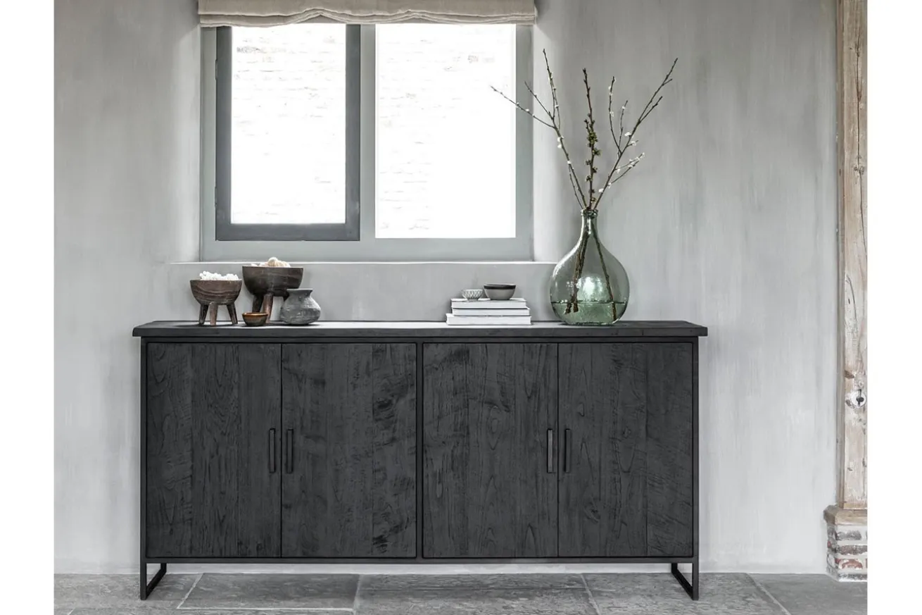 Die schwarzen Metallfüße des Sideboards dienen nicht nur der Stabilität, sondern sind auch ein markantes Designelement. Sie setzen einen modernen Akzent und harmonieren perfekt mit der rustikalen Eleganz des Teakholzkorpus.