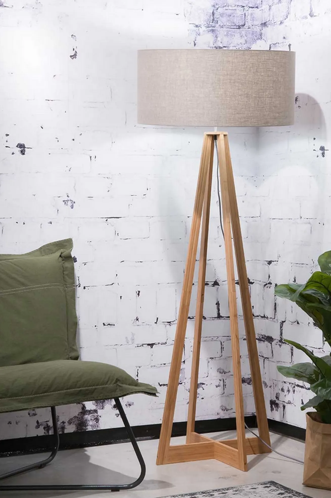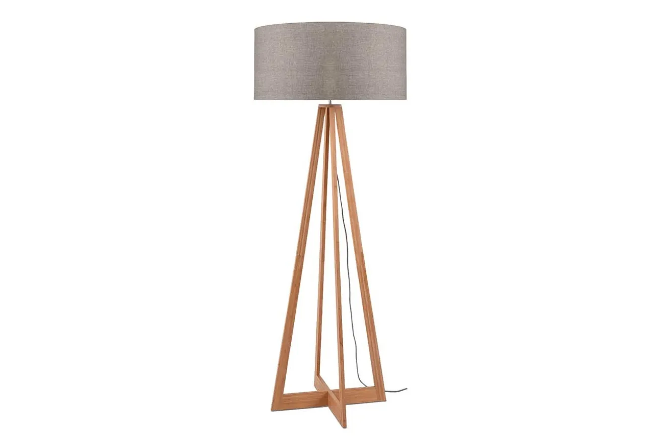 Eine Lampe im modernen Stil, die aus nachhaltigen Materialien besteht, das ist unsere Stehlampe Everest. Sie hat die Maße Durchmesser 60cm sowie Höhe 158cm. Der im skandinavischen Stil gefertigte Deckenfluter besteht aus einem Holzkorpus und Stoffschirm. Der Ständer aus vier Füßen ist aus dem sehr leichten Bambus in seiner Naturfarbe. Die Streben des Fußes aus nachhaltigem Rohstoff laufen oben zusammen und halten eine Glühbirne, die hier nicht inklusive ist. Versteckt wird diese von einem beigefarbenen Lampenschirm aus Leinen. Bei dieser Konstellation strahlt Licht nicht nur nach oben an die Wände und Decke, sondern auch im unteren Wandbereich wird es hell. Beide kräftige Farben der Materialien, die hier eine Standleuchte ergeben, harmonieren perfekt miteinander.