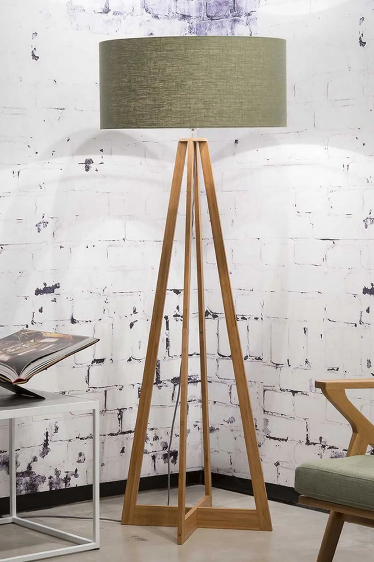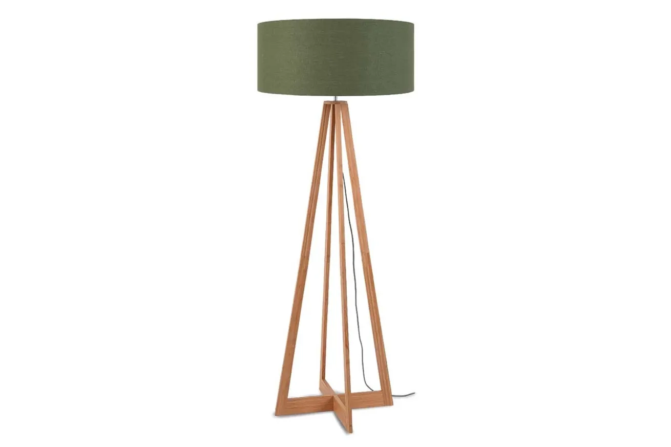 Eine Lampe im modernen Stil, die aus nachhaltigen Materialien besteht, das ist unsere Stehlampe Everest. Sie hat die Maße Durchmesser 60cm sowie Höhe 158cm. Der im skandinavischen Stil gefertigte Deckenfluter besteht aus einem Holzkorpus und Stoffschirm. Der Ständer aus vier Füßen ist aus dem sehr leichten Bambus in seiner Naturfarbe. Die Streben des Fußes aus nachhaltigem Rohstoff laufen oben zusammen und halten eine Glühbirne, die hier nicht inklusive ist. Versteckt wird diese von einem grünen Lampenschirm aus Leinen. Bei dieser Konstellation strahlt Licht nicht nur nach oben an die Wände und Decke, sondern auch im unteren Wandbereich wird es hell. Beide kräftige Farben der Materialien, die hier eine Standleuchte ergeben, harmonieren perfekt miteinander.