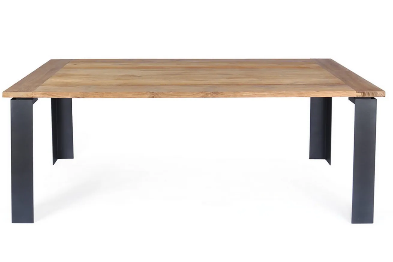 Dieser Tisch ist ein moderner Landhaustisch. Zusammengesetzt ist dieser aus einer Massivholzplatte aus Teak und vier Füßen aus Stahl. Die Platte aus Holz zeichnet sich durch ihre graubraune Farbe aus. Die Oberfläche ist unbehandelt, so dass nicht nur die Farbe, sondern auch die Maserung in ihrer natürlichen Weise vorhanden sind. Da der Tisch im Gesamten eine Breite von 180cm, eine Höhe von 78cm sowie eine Tiefe von 100cm hat, handelt es sich bei diesem Produkt um einen rechteckigen Tisch, den man auch in die Küche stellen kann. Das rustikale Aussehen wird von den vier dunkelgrau beschichteten Füßen aus Rohstahl durchbrochen, so dass der Esszimmertisch einen Industrial Look erhält. Mit den dazu passenden schwarzen Stühlen aus Metall wird der Look im Loft Stil erweitert und unterstrichen.