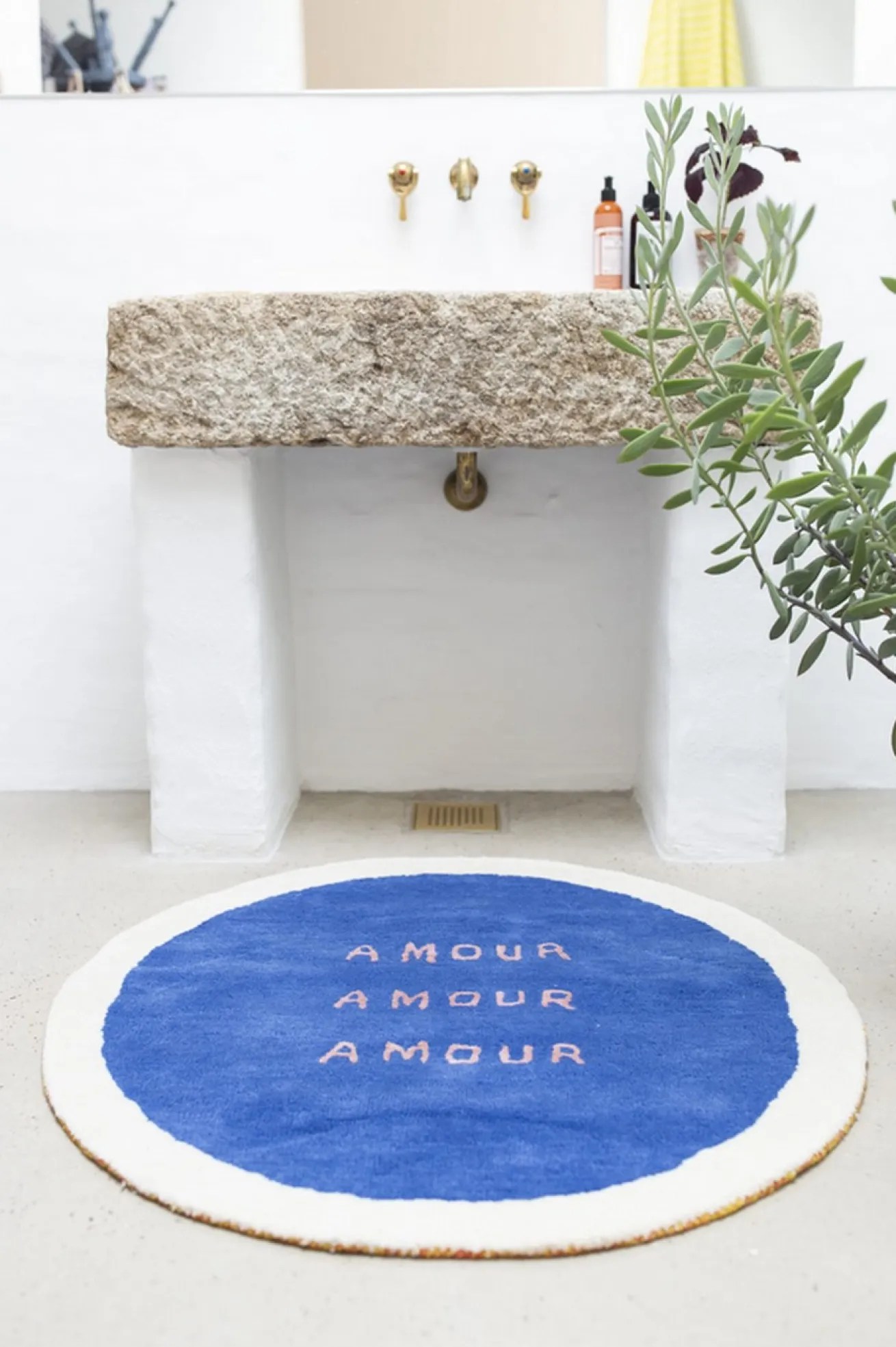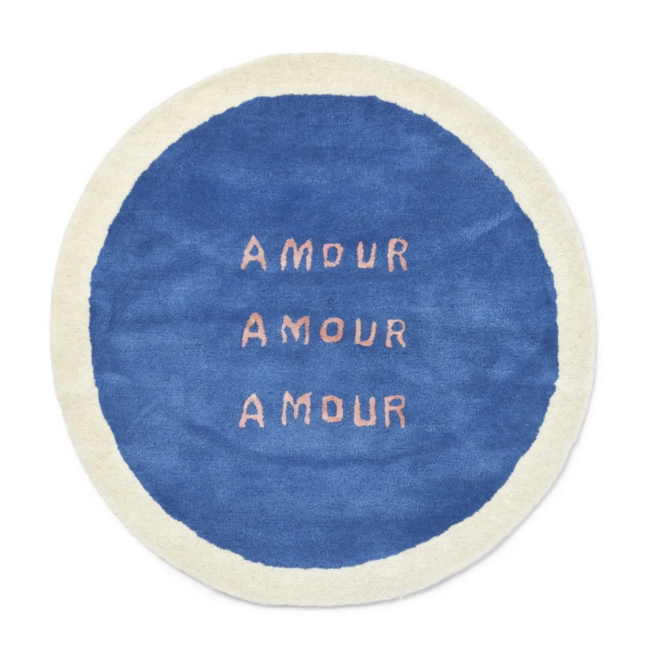 Der Amour-Teppich besteht aus 100 % Wolle mit lebendigen, leuchtenden Farben und dem Wort „Amour“ in der Mitte. Die aus Viskose gefertigten Buchstaben stechen auf subtile, schimmernde Weise hervor.