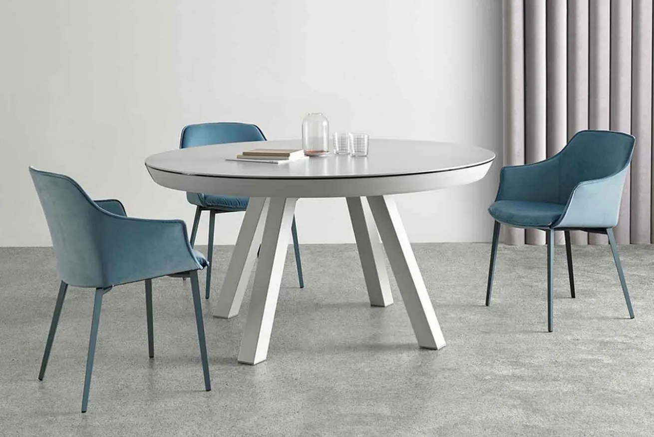 Wenn Sie Zweifel daran haben, dass all Ihre Freunde an Ihrem Geburtstag an diesem Tisch Platz nehmen können, dann liegen Sie ganz falsch. Denn bei diesem runden Produkt für Esszimmer und Küche handelt es sich um einen Tisch, der nicht aus Holz, dafür aber ausziehbar ist. Er hat einen Durchmesser von 125cm und nach dem Ausziehen 165cm sowie eine Höhe von 75cm. Das Produkt besteht aus vier weißen Metallbeinen, die eine Keramikplatte tragen. Diese lässt sich zur Seite schieben, so dass Sie einen Mittelteil herausziehen und so den Tisch verlängern können. Kein Problem für alle, die ab und zu einen größeren Esszimmertisch brauchen. Durch die schlichte Oberfläche lässt sich das Produkt mit farbigen Esszimmerstühlen kombinieren und passt nicht nur in Räumlichkeiten im Shabby Chic oder Landhausstil, sondern auch in moderne Milieus.