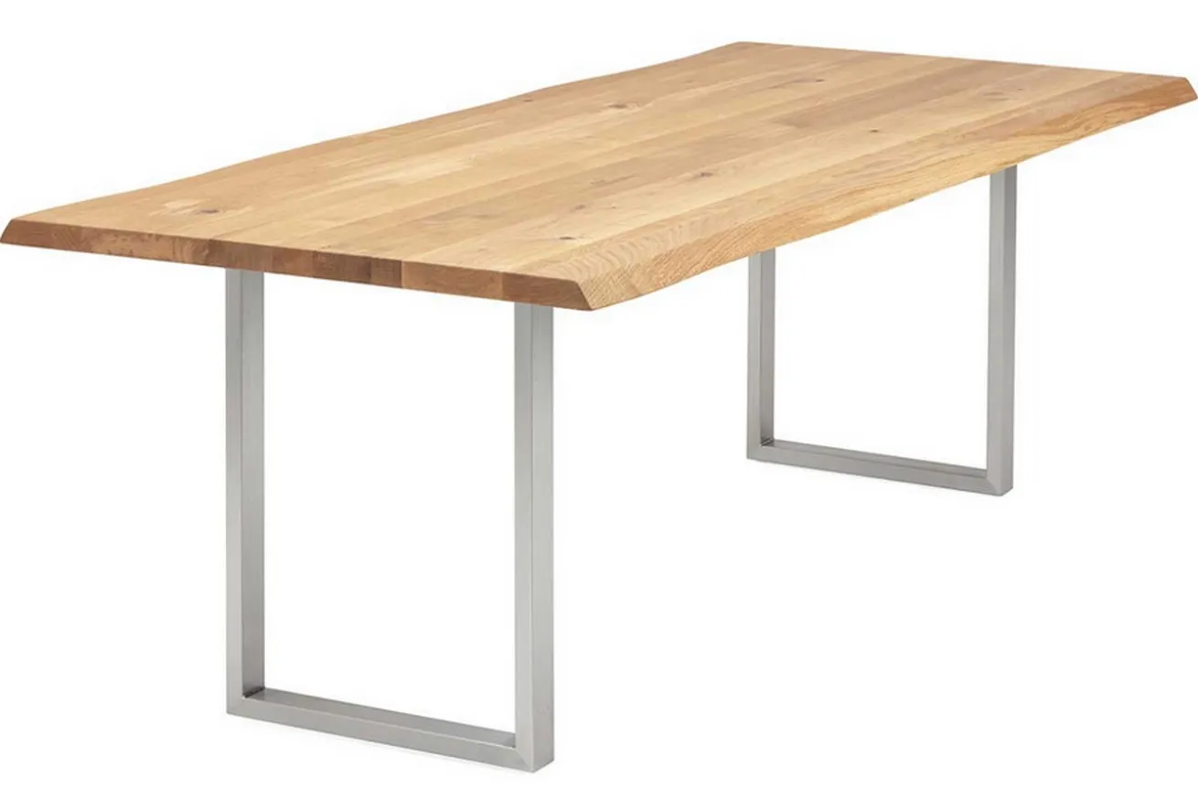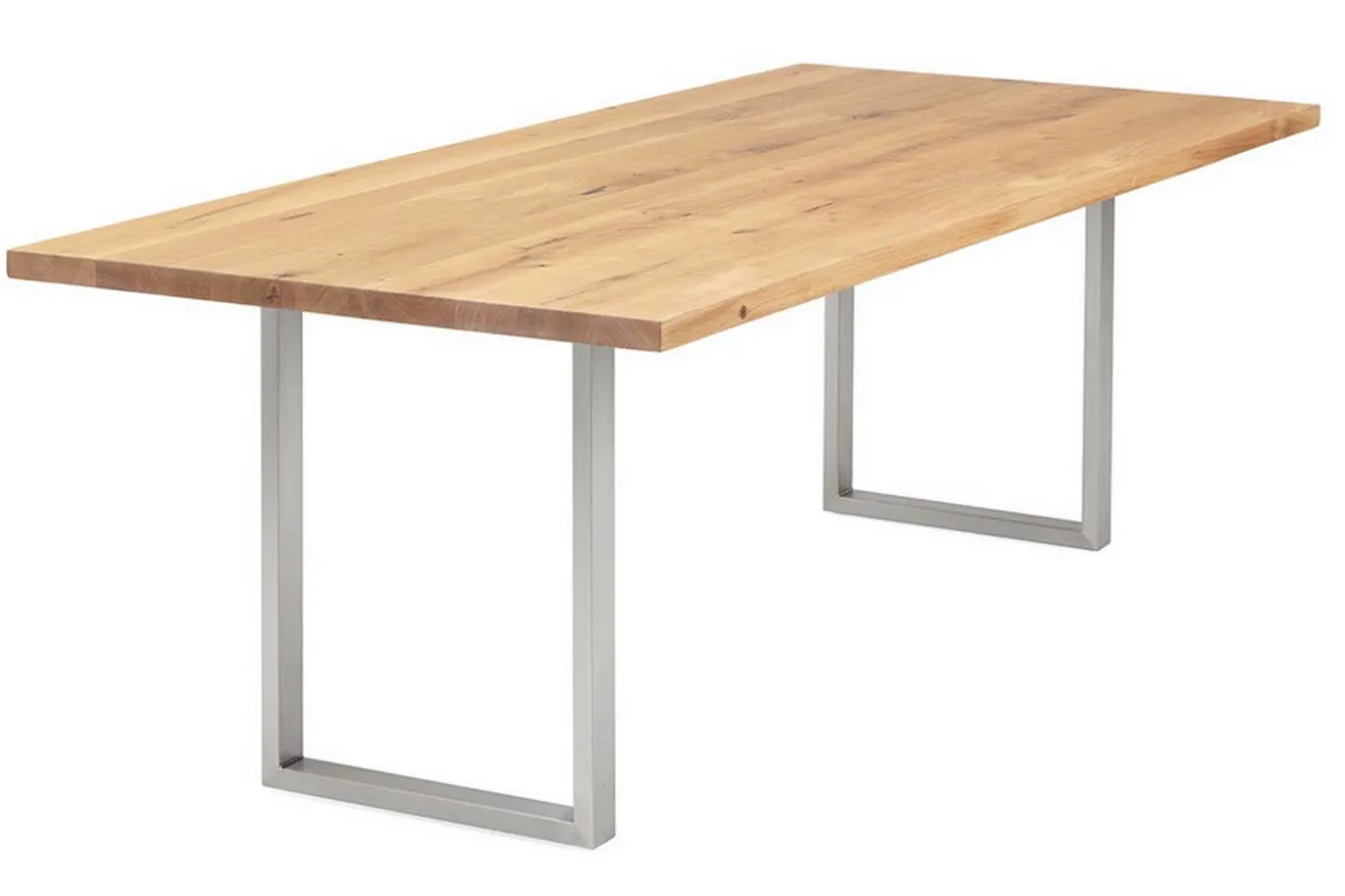 Hier ist Ihr moderner Esstisch! Dieser Tisch im nordischen Look überzeugt durch seine massive Eichenholzplatte, die von einem Tischgestell in feinem U-Profil aus Edelstahl getragen wird. Er hat die Maße Breite 140cm, Tiefe 90cm und Höhe 75cm. Die natürliche Farbe mit gleichmäßiger Maserung wird nicht nur dadurch unterstrichen, dass die Platte aus einzelnen Holzbohlen besteht, die aneinandergepresst dieses einzigartige Design ergeben, sondern auch dadurch, dass Äste und Risse offen sind, da die Oberfläche unbearbeitet ist. Durch die U-förmigen Beine wird die Natürlichkeit des Holzes unterstrichen. Besonders gut passen Möbel aus Eichenholz in Esszimmer im skandinavischem Stil und Milieus, die schlicht eingerichtet sind und den Fokus auf Naturmaterialien setzen.