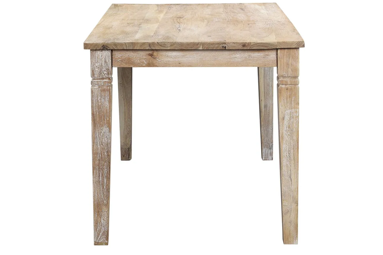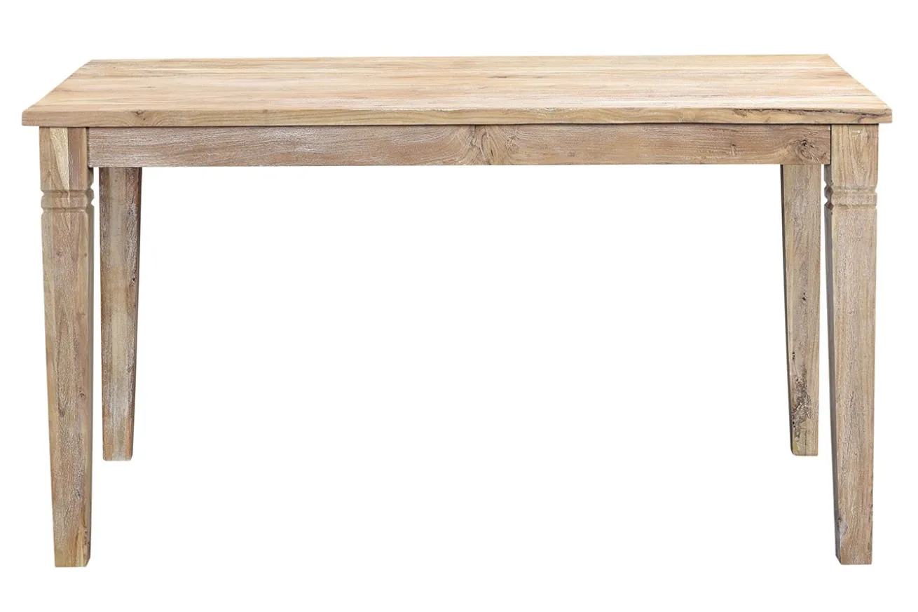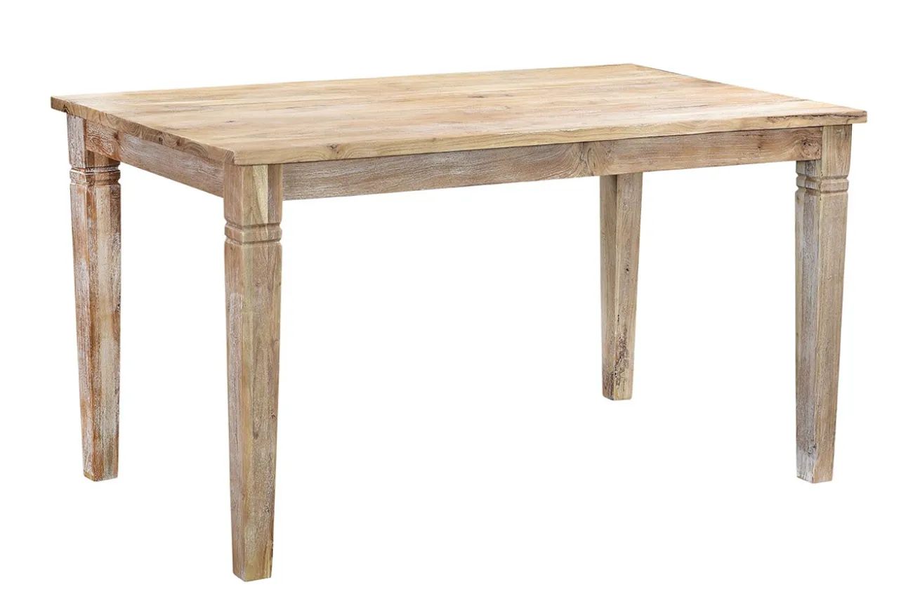 Der für im Landhausstil eingerichteten Esszimmer gedachte Tisch ist aus Akazienholz. Mit einer Breite von ca. 140cm, einer Tiefe von ca. 80cm und einer Höhe von ca. 76cm ist dieser weiß pigmentierte Esszimmertisch rechteckig und steht auf vier Füßen, die nicht unterhalb der Platte, sondern außen am 2,5cm verstärkten Rand befestigt sind. Oben werden sie von dekorativen Einkerbungen verziert. Zum Schutz wurde die Oberfläche lackiert. Stellen Sie zum Raum passende Stühle an dieses massive Möbelstück und dekorieren Sie für die vollständige Gemütlichkeit mit passenden Fellkissen oder -decken ein.