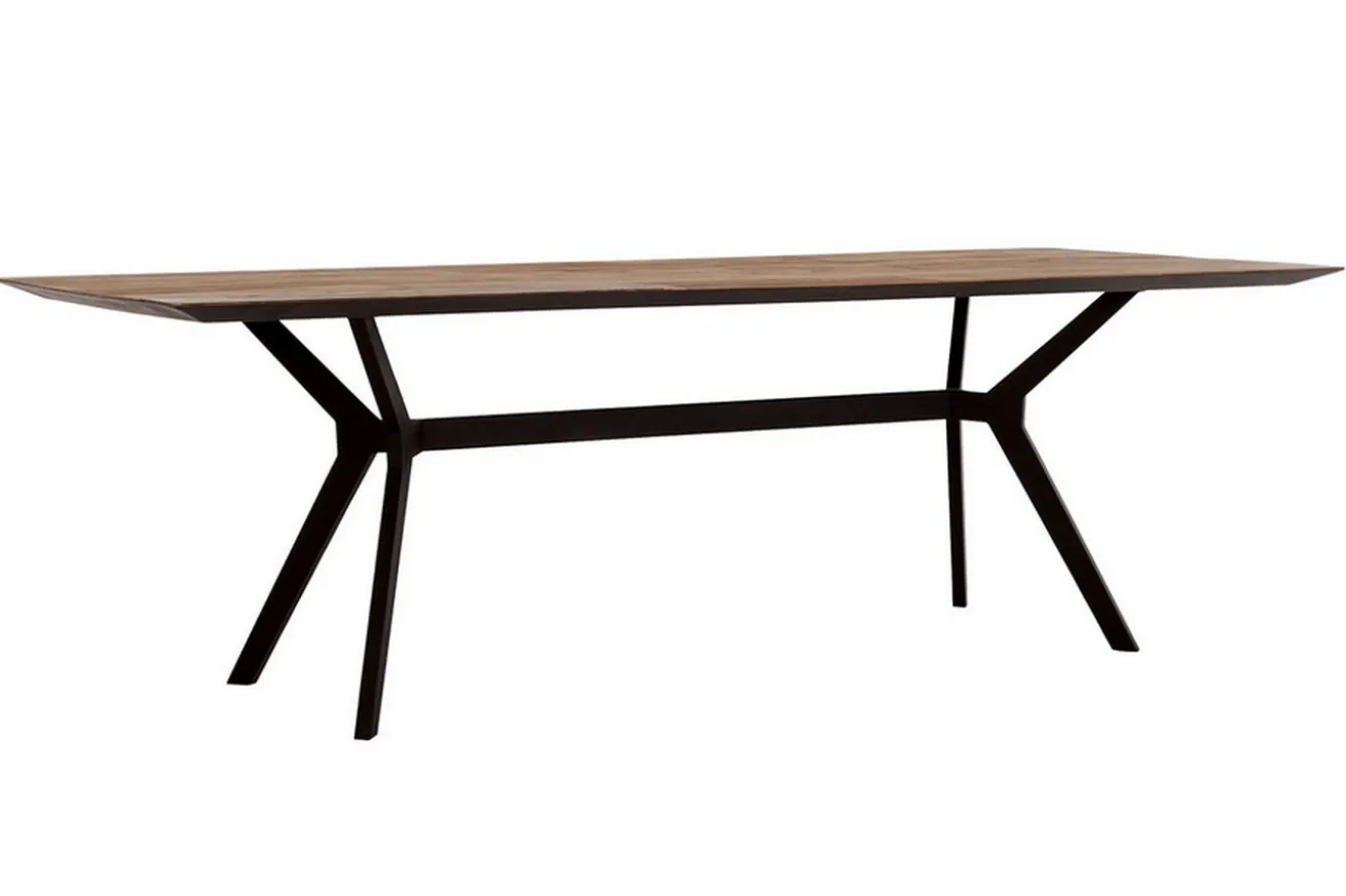 Unser Esstisch besteht aus recyceltem Teakholz und hat ein Gestell mit konischen Beinen in Bumerangform. Die Tischplatte wird an allen Kanten schmaler, schweizer Kante und hat abgerundete Ecken. Die Größen der verfügbaren Esstische sind 200cm, 225cm, 250 cm. Sprechen Sie uns an.
