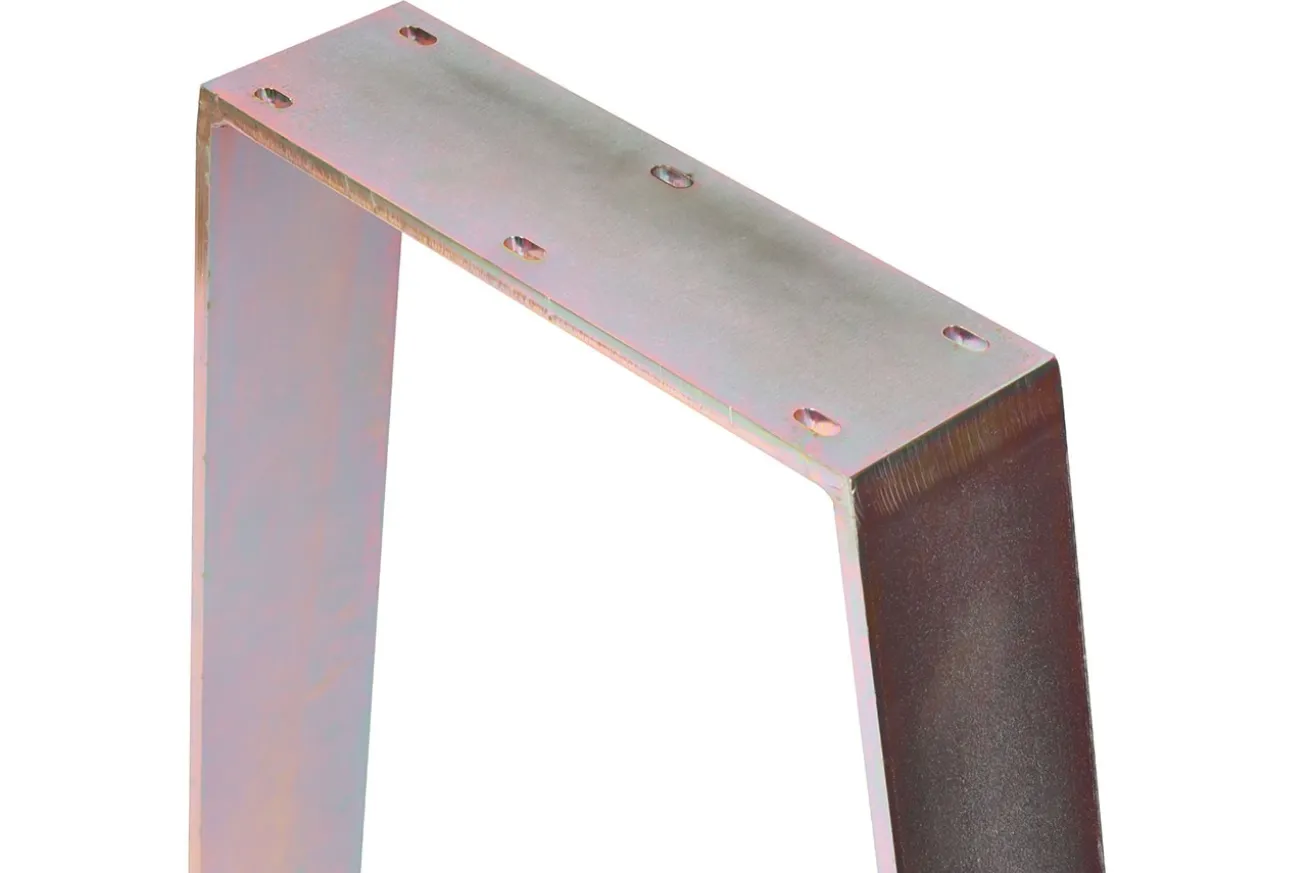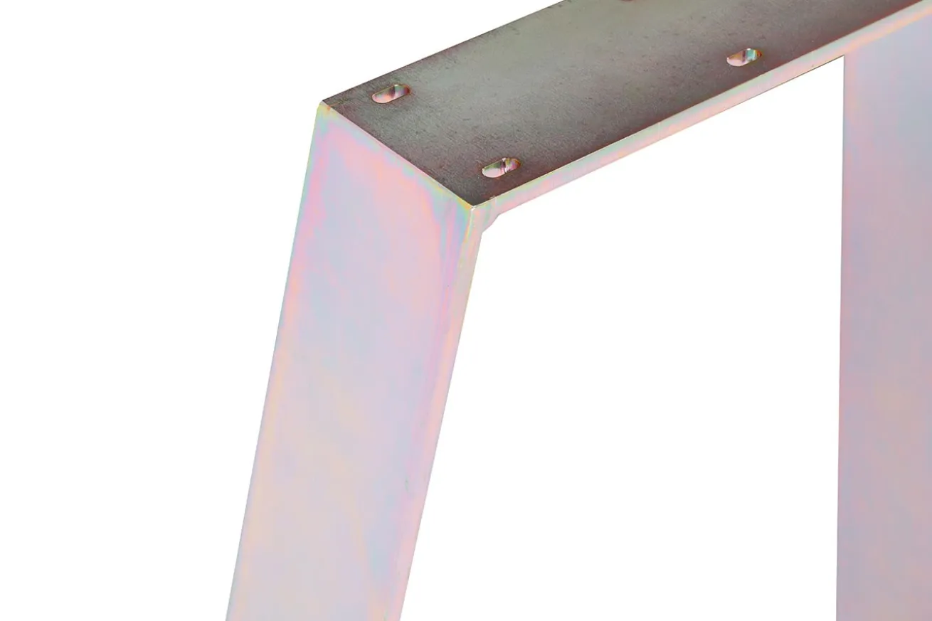 Warum sollte es ein einfaches Gestell sein, nur weil man sich eine ausgefallene Tischplatte aussucht? Man kann auch beides kombinieren und somit ein richtiges Einzelstück erhalten. Etwas, das so in keinem anderen Esszimmer steht. Dieses aus Rohstahl bestehende Bein wurde irisierend galvanisierend und leuchtet, je nach Perspektive, in einem anderen metallischen Ton.
