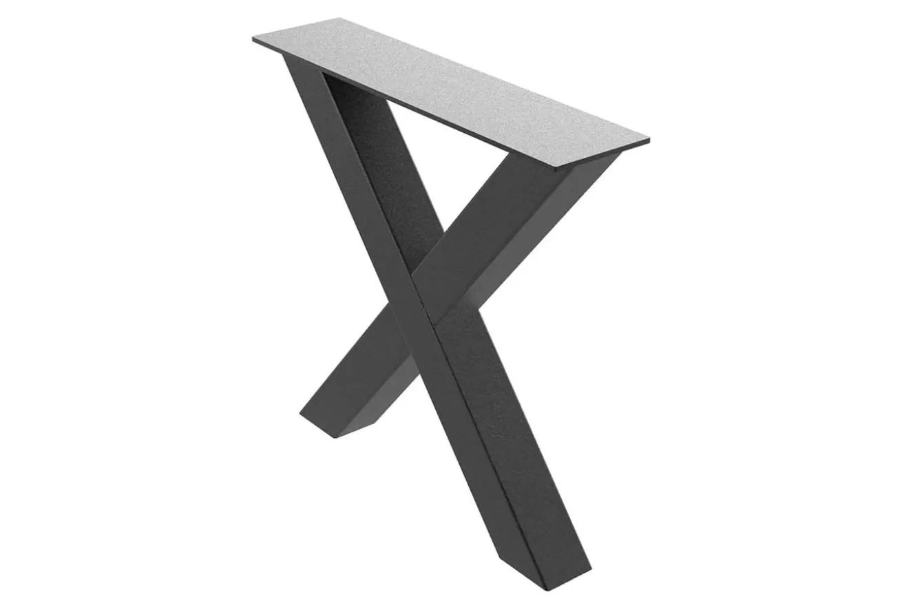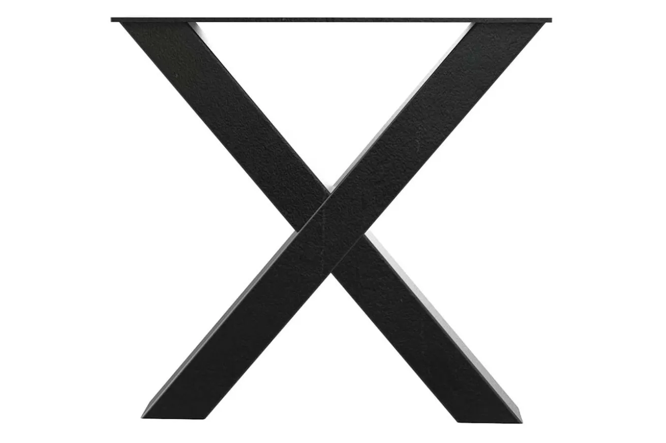 Das Produkt ist ein modernes Tischuntergestell aus Metall in X-Form mit sichtbaren Schweissnähten im Industrial Style. Der Tischfuß aus Stahl hat die Maße Breite 83cm, Höhe 72cm und Tiefe 13-90cm.