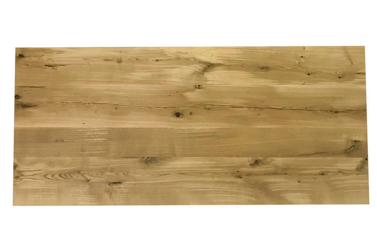 Diese Massivholztischplatte besteht aus drei Holzplanken, die zusammengepresst sind, um eine vielfältige Maserung der Eiche hervorzuheben. Die natürlich-warme Farbgebung von grau-gelb bis gelbbraun ist hier sichtbar vertreten.