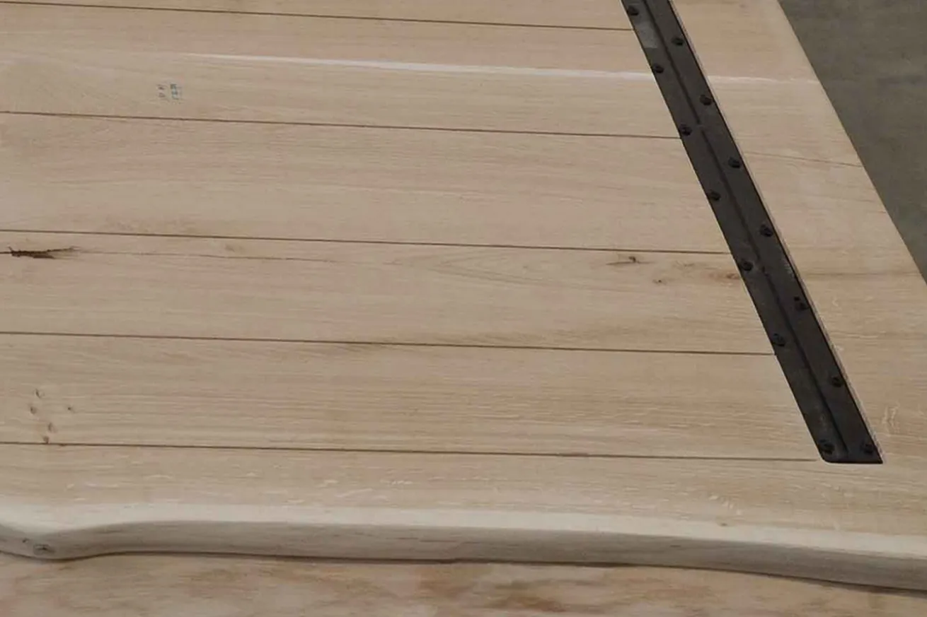 Diese Tischplatte aus Massivholz wurde aus massiver Eiche gefertigt, die am häufigsten vorkommende Baum- und Holzart in Deutschland. Die Platte besteht aus drei Holzbohlen, welche zusammengepresst wurden, um die unterschiedlichen Maserungen zu einer unikaten Tischplatte zu machen. Diese Planken variieren in ihrer Breite bis zu 25cm. Die natürliche Farbe steht im Kontrast zu den dunkleren Astlöchern und Maserungen, die zum naturbelassenen Erscheinungsbild der Platte gehören. Die Tischplatte hat eine Breite von 160cm, eine Tiefe von 80cm und eine Höhe von 6cm. Diese erschließt sich daraus, dass die Tischplatte am Rand aufgedoppelt ist und diese Dopplung ebenfalls 3cm hat. Das Ziel einer Aufdopplung ist immer, die Tischplatten leichter zu machen und auch preiswerter. Die Tischkante ist gerade. Die rechteckige Tischform wird hinten an den Lamellen mit einem Stahlprofil fixiert, was das Verziehen der einzelnen Planken verhindert.