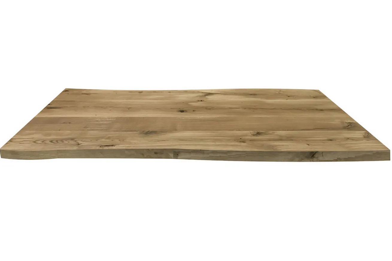 Unsere Tischplatte aus astiger Eiche hat eine Tiefe von 60cm, eine Breite von 50cm und eine Höhe von 8cm und ist aufgedoppelt. Die Tischplatte hat eine organische Kante.