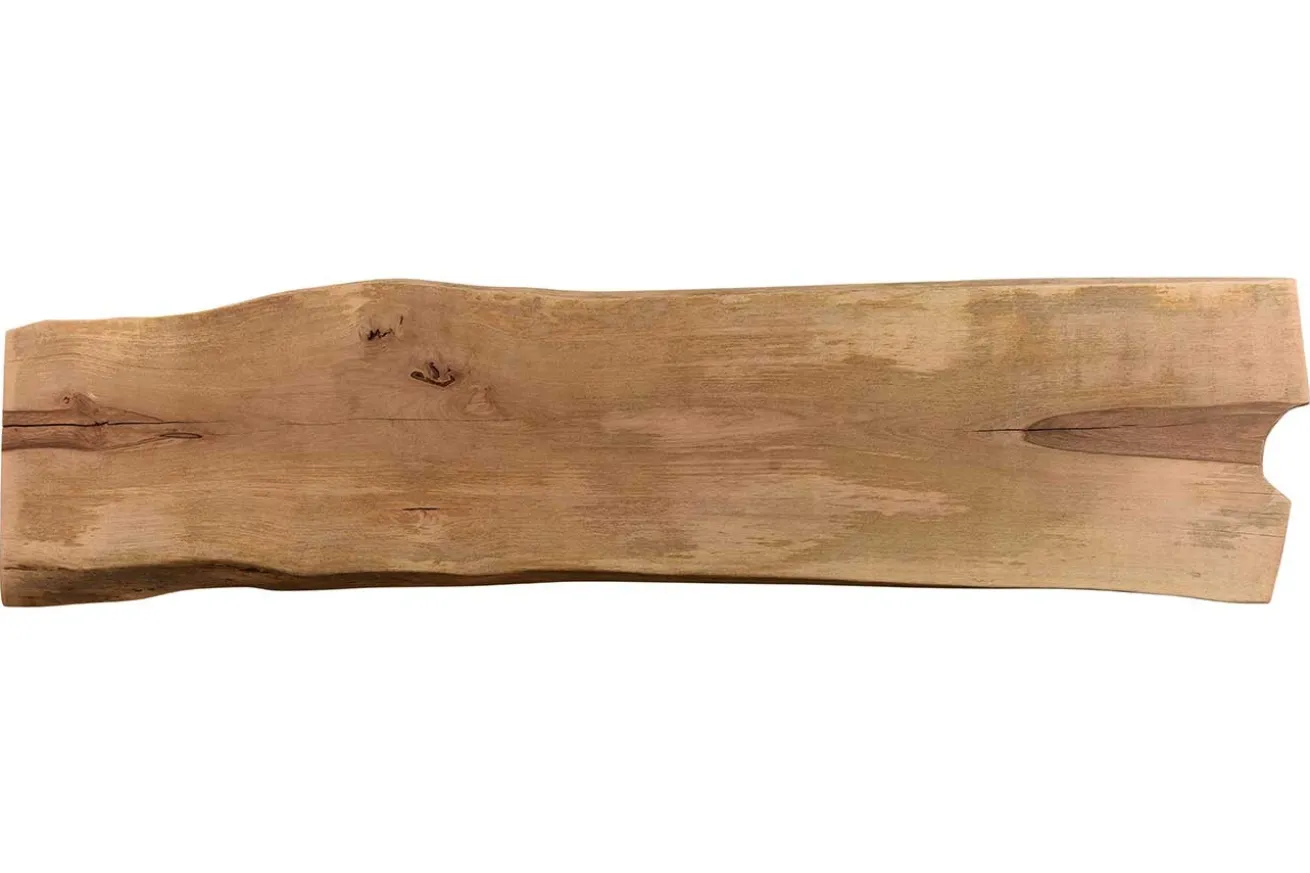 Unser Produkt hat die Maße Breite 308cm, Tiefe 80cm und eine Höhe sowie Stärke von 7cm. Dadurch, dass das Massivholzmöbel aus einem Stück gefertigt wurde, ist sind Form und Kante der Platte organisch. Die Oberfläche ist unbehandelt, kann aber gegen einen Aufpreis auch behandelt werden.