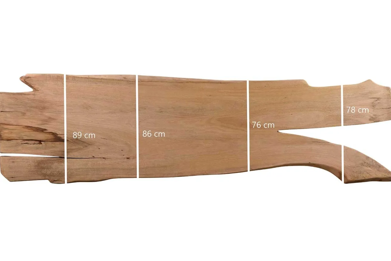 Unser Produkt hat die Maße Breite 327cm, Tiefe 70cm und eine Höhe sowie Stärke von 7cm. Dadurch, dass das Massivholzmöbel aus einem Stück gefertigt wurde, ist sind Form und Kante der Platte organisch. Die Oberfläche ist unbehandelt, kann aber gegen einen Aufpreis auch behandelt werden.