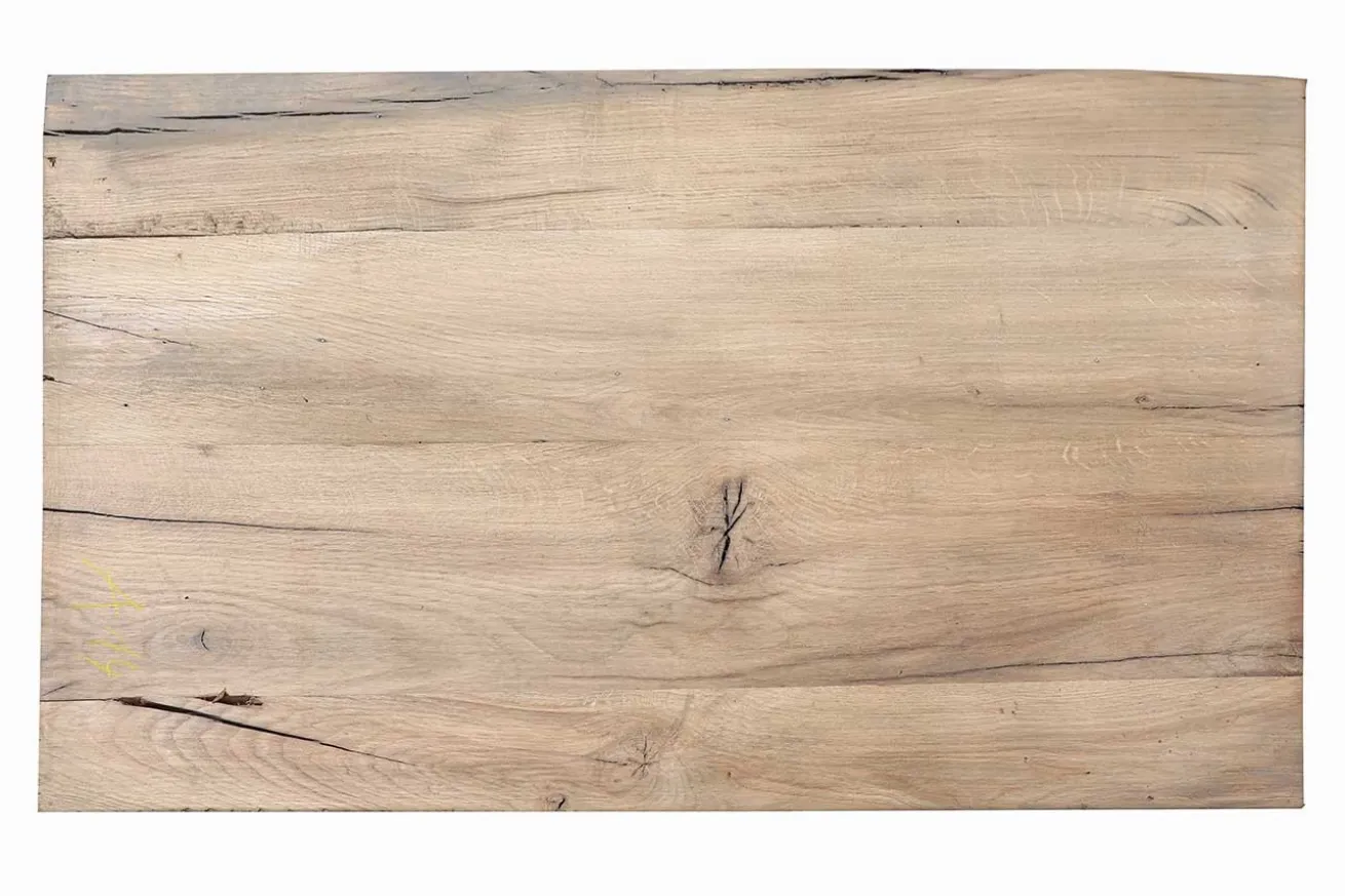Gebrauchsspuren sind in den dunkleren Bereichen am Rand und in der Tischmitte sichtbar, da es sich um wiederverwendetes Eichenholz handelt. Diese Holzplatte lässt sich wunderbar mit einem passenden Gestell in Landhausstil-Räumlichkeiten kombinieren. Sie kann sowohl als Ess- und Schreibtisch als auch als Massivholzmöbel im Kinderzimmer für Spiel- und Hausaufgabentische genutzt werden.