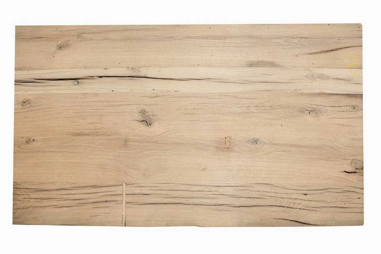 An den dunkleren Stellen an den Rändern und in der Mitte der Platte sind Gebrauchsspuren sichtbar, da es sich um recyceltes Eichenholz handelt, das wiederverwendet wurde.