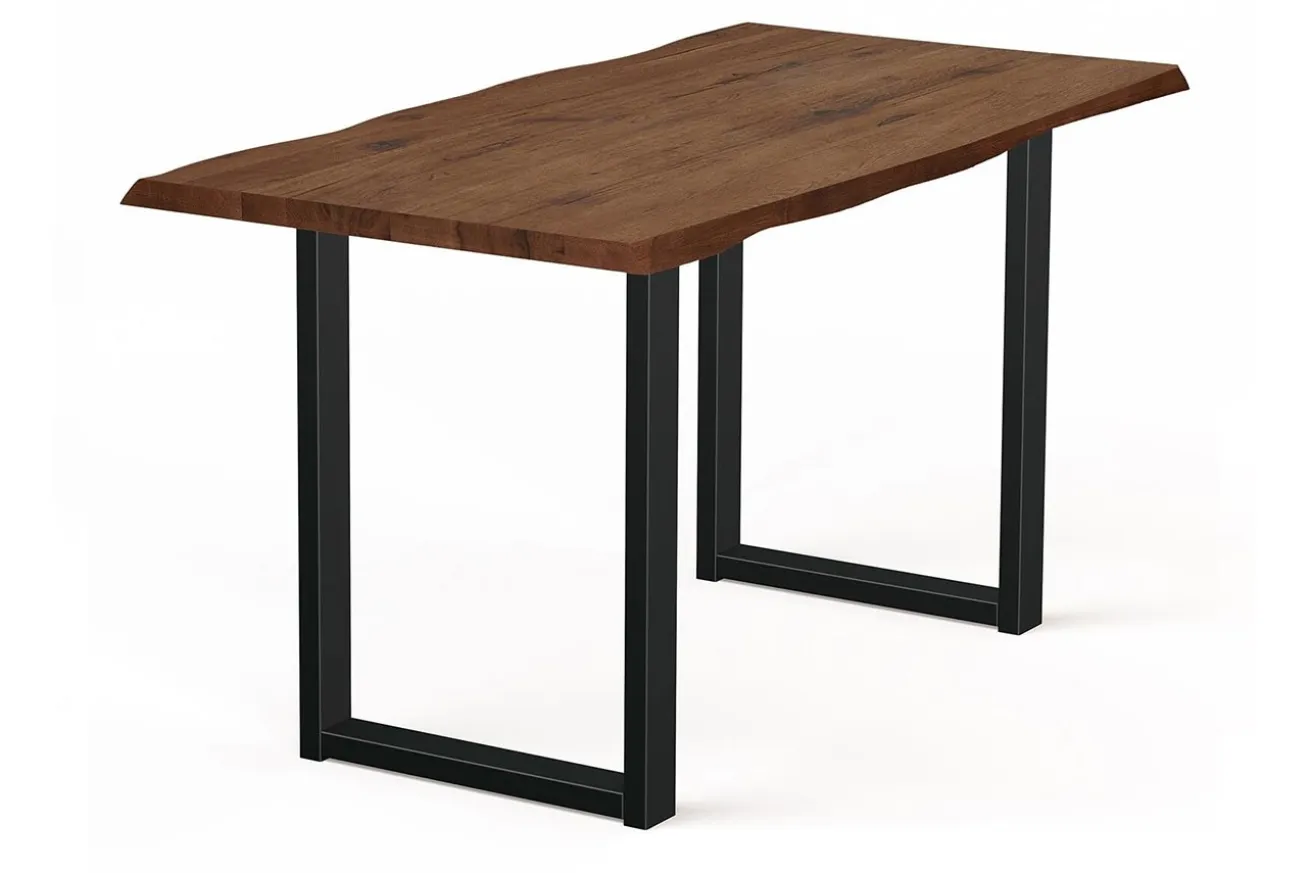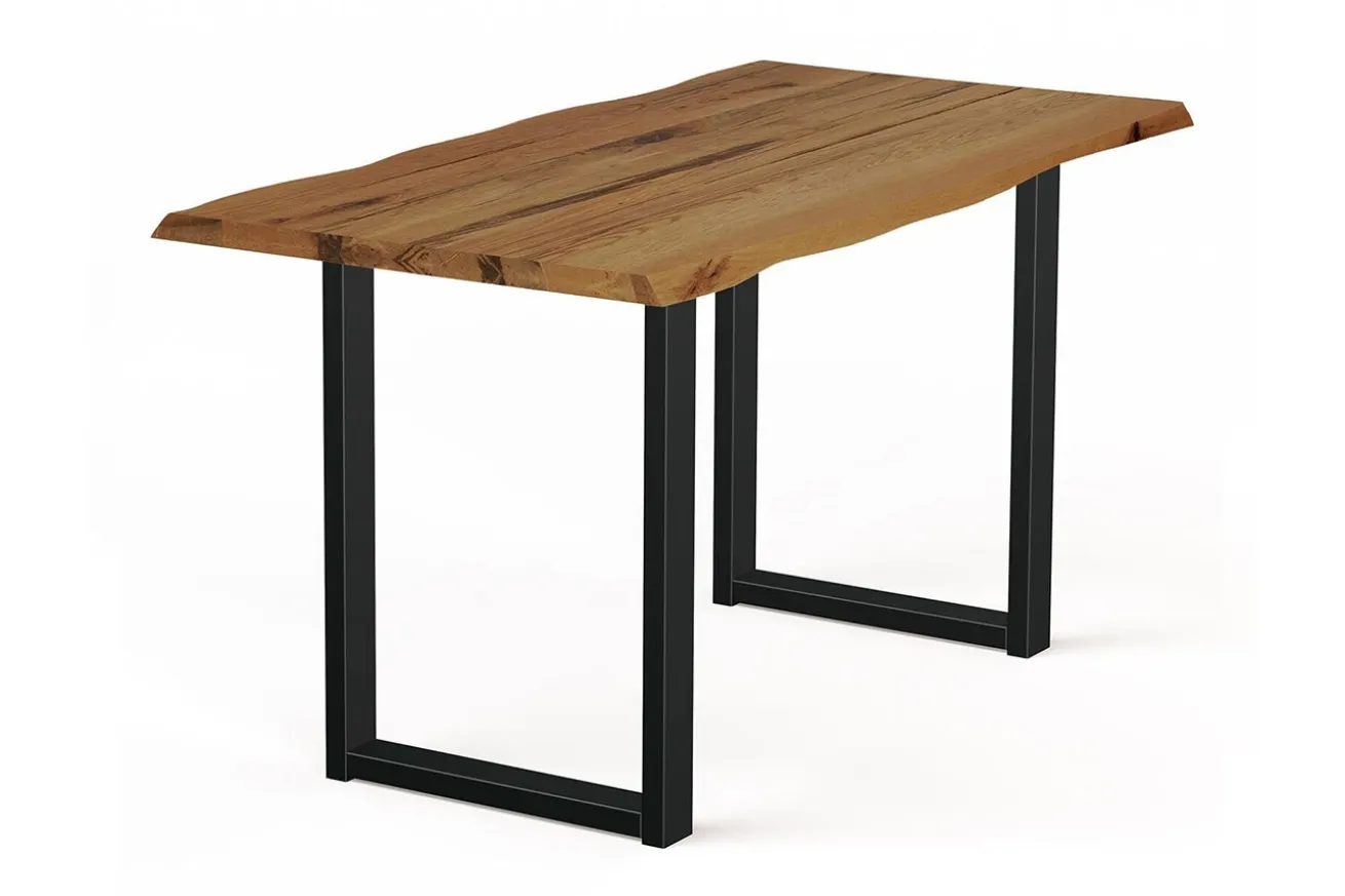 Die zwei U-förmigen Metallfüße in elegantem Schwarz bieten nicht nur eine stabile Basis, sondern setzen auch einen markanten Kontrast zur warmen Holzplatte. Ihr modernes Design verleiht dem Tresentisch eine zeitgemäße Note und harmoniert perfekt mit dem rustikalen Charakter des Eichenholzes.