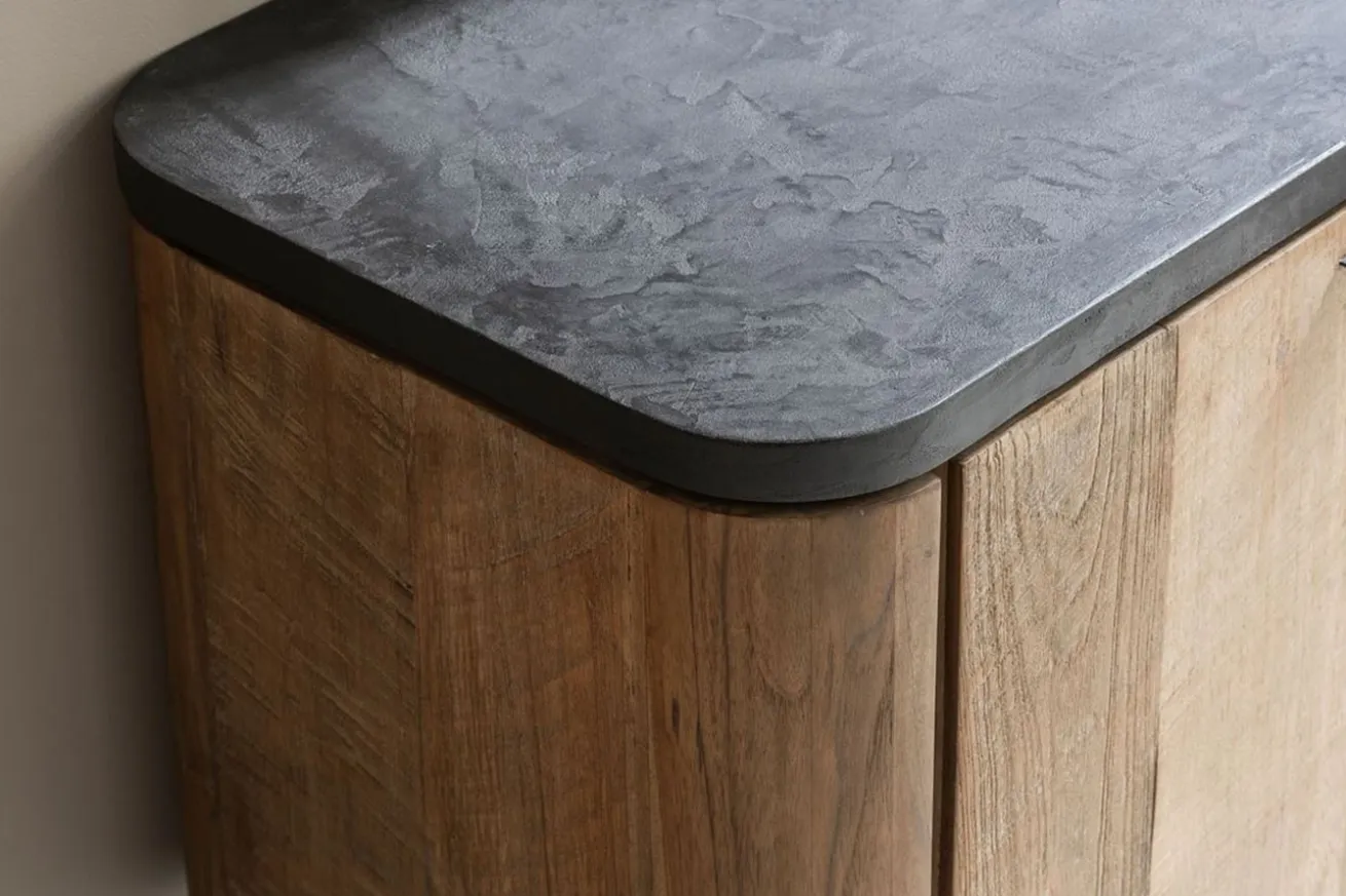 Der Korpus des TV-Boards besteht aus recyceltem Teakholz, das nicht nur umweltfreundlich ist, sondern auch eine einzigartige und charaktervolle Maserung aufweist. Die beiden Türen und zwei Schubladen bieten ausreichend Stauraum für Ihre Multimedia-Geräte, DVDs, Fernbedienungen und andere Wohnaccessoires, während sie gleichzeitig Ordnung und Übersichtlichkeit in Ihrem Wohnbereich schaffen.