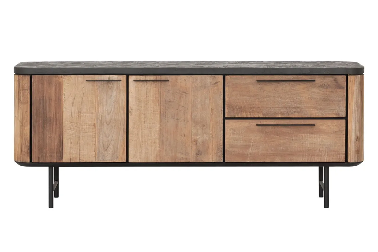 Die oberen und unteren Sims des Boards sind aus Mortex in elegantem Schwarz gefertigt, was dem Möbelstück einen modernen Touch verleiht und gleichzeitig für Stabilität und Langlebigkeit sorgt. Diese klare Linienführung setzt einen stilvollen Kontrast zum rustikalen Charme des Teakholzes.