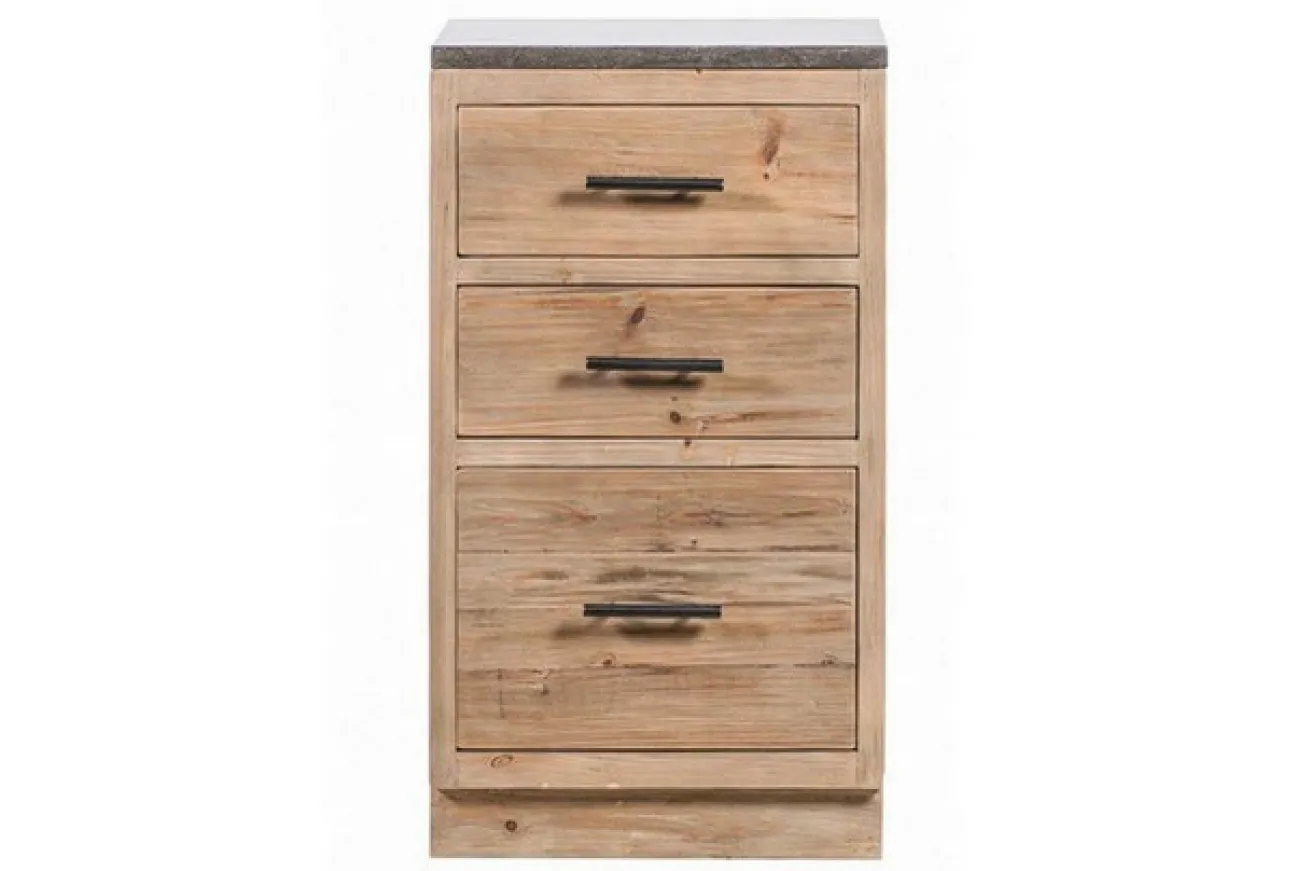 Holen Sie sich den Charme des Landhaus-Stils mit dem Luxus eines modernen Möbels auf die überdachte Terrasse oder in die Wohnung. Der Unterschrank Nimes mit drei Schubladen aus leicht grau pigmentiertem recyceltem Kiefernholz macht´s möglich. Eine schwere massive Steinplatte in dunklen graubraunen Farbtönen sorgt bei Ihren Freunden für Aufsehen. (nicht Winterfest, im Aussenbereich wird das Holz stärker Arbeiten, als im Innenbereich. Es können Spannungsrisse auftreten. Schubladen und Türen sollten in regelmäßigen Abständen überprüft und eingestellt werden) In den drei grossen Schüben können Sie jede Menge Küchenutensilien verschwinden lassen!