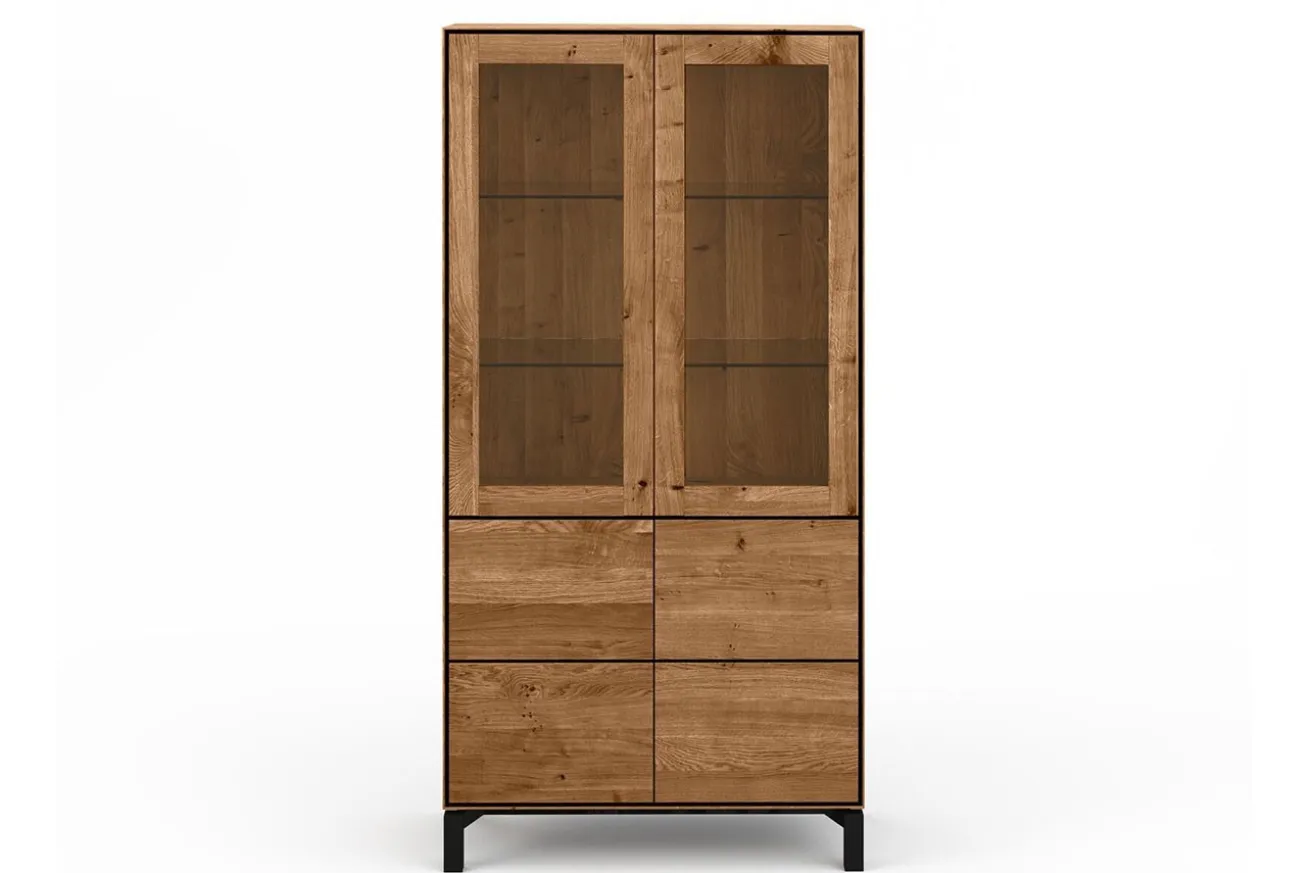 Die warme Ausstrahlung der Wildeiche verleiht dem Schrank eine gemütliche Atmosphäre, während die lackierte Oberfläche das Holz schützt und seine natürliche Schönheit betont. Mit vier Schranktüren, davon zwei oben mit elegantem Glas versehen, bietet dieser Vitrinenschrank nicht nur großzügigen Stauraum, sondern auch die Möglichkeit, Ihre wertvollen Sammlerstücke und Dekorationsgegenstände stilvoll zu präsentieren.