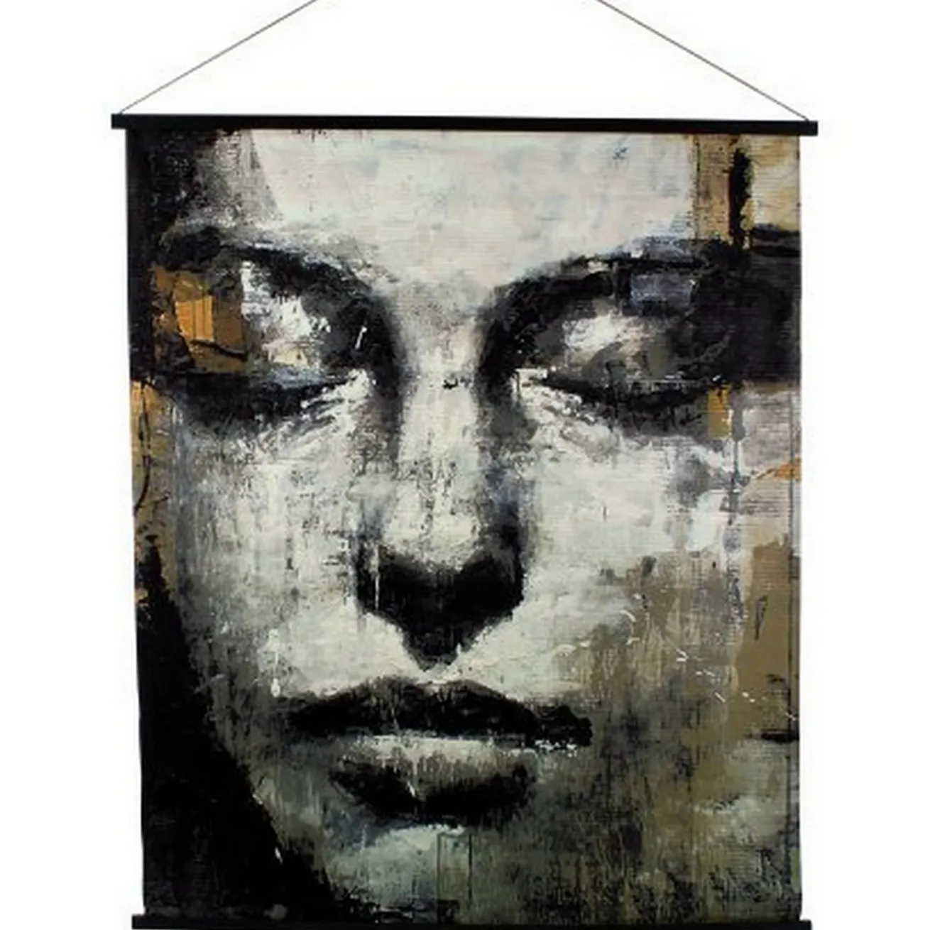 Die trendige Wanddeko in Form eines Hängebildes aus Textilstoff zeigt das Gesicht einer jungen Frau stark abstrahiert in den Farbe schwarz und gold. Ein Must Have für jede Wohnung. Es ist kein Leinwandbild, sondern ein stoffbild. Dank der Schnur bietet sich die Möglichkeit, das Produkt mit dem Motiv direkt aufzuhängen.