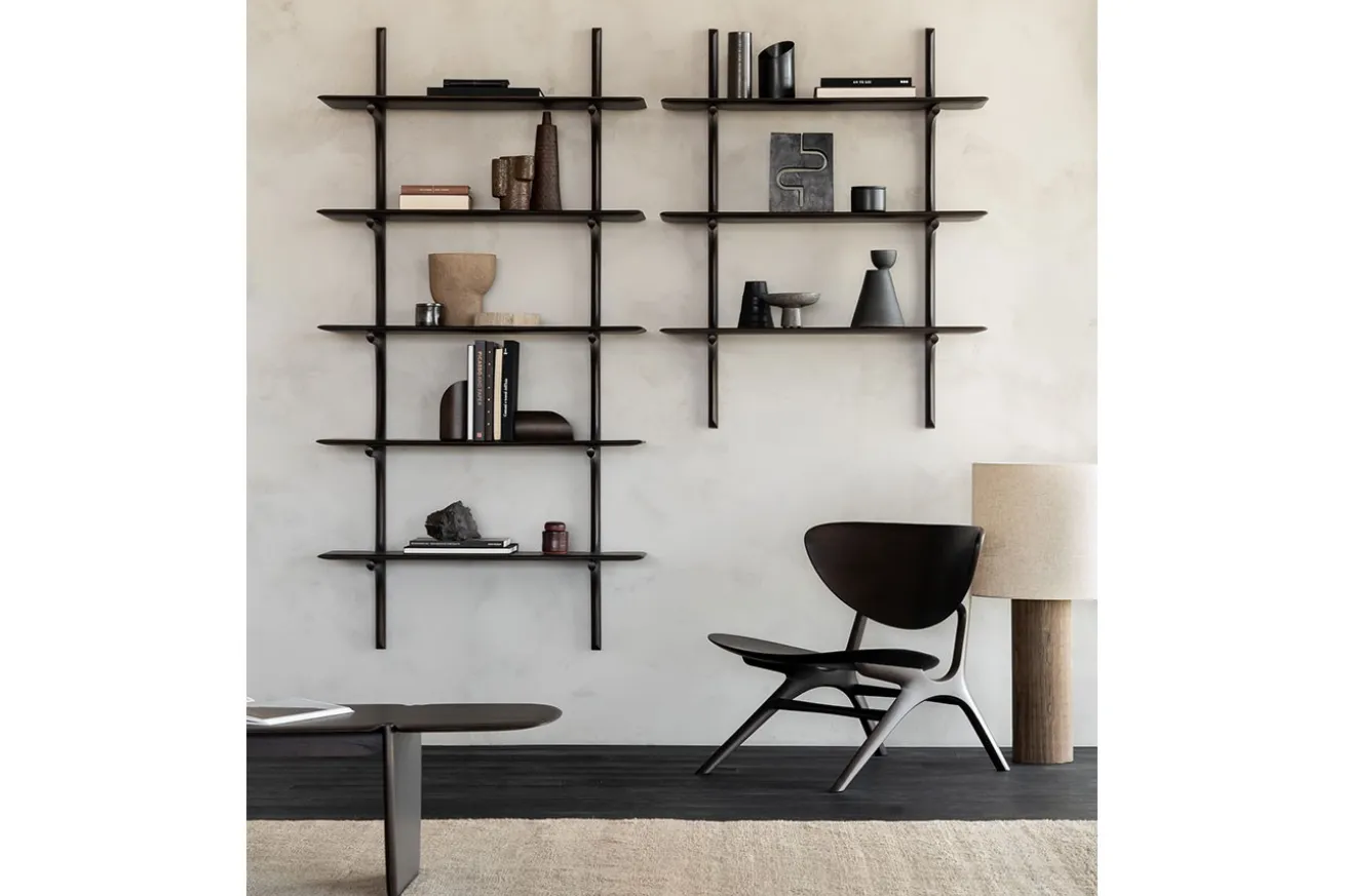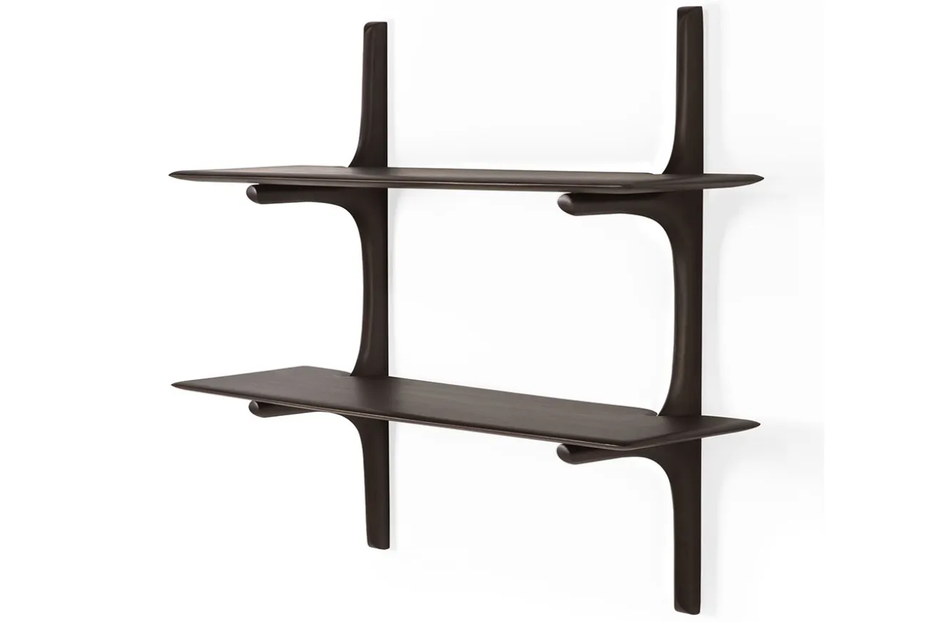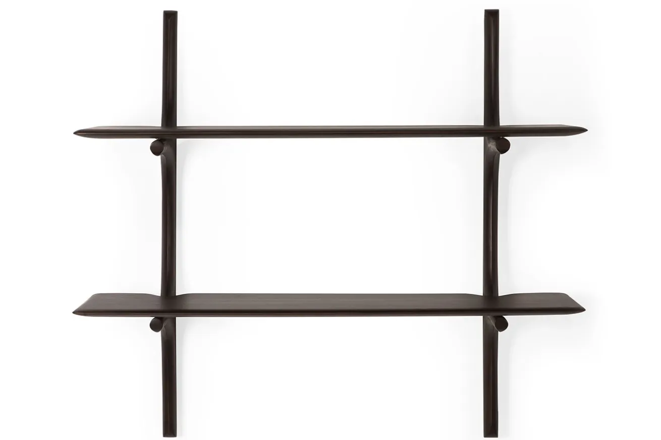Die PI-Kollektion ehrt das Design der Natur, indem sie ihre organischen Formen und Linien bewahrt. Das Wandregal aus dunkelbraun gefärbtem Mahagoni-Holz präsentiert sich mit zwei übereinander angeordneten Böden, die sanft geschwungen aus der Wandhalterung herauswachsen. Jedes Exemplar wird von Hand veredelt – so entsteht ein einzigartiges Finish, das die natürliche Struktur des Holzes sichtbar macht. Das Regal kombiniert skandinavische Leichtigkeit mit skulpturaler Präsenz und bietet eine stilvolle Bühne für Bücher, Objekte oder Erinnerungsstücke.