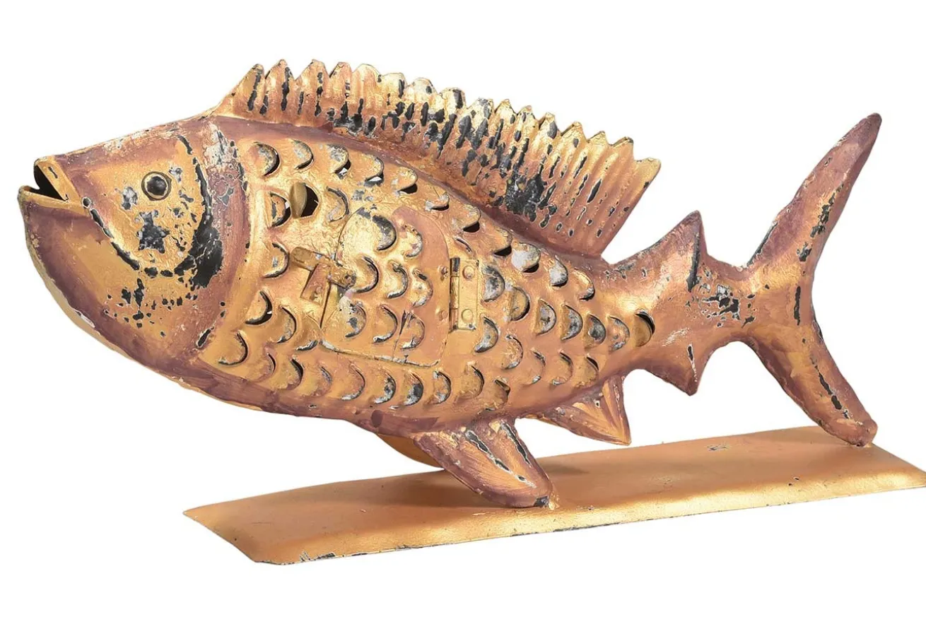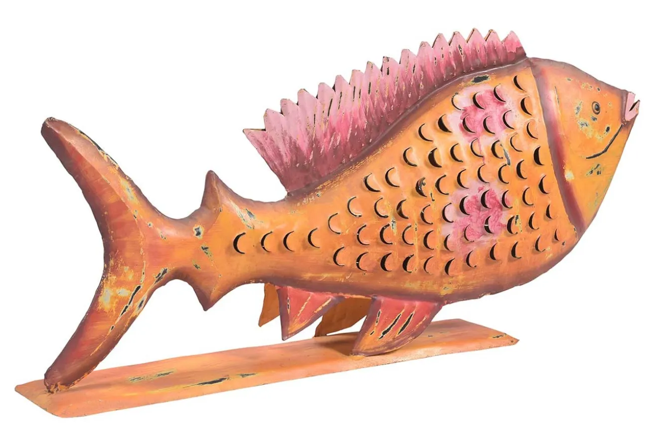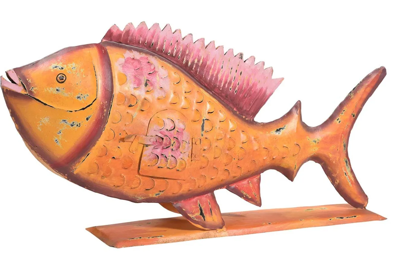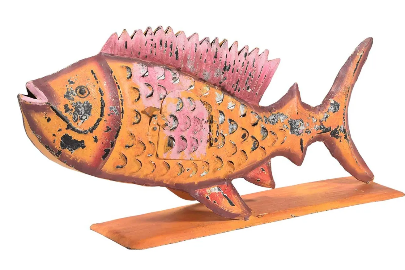 Auf den ersten Blick sieht dieser orangene Metallfisch gar nicht aus, als habe er eine besondere Funktion als die eines bunten Wohnaccessoires. Aber wenn man ihn sich genauer betrachtet, den Fisch, der 28cm hoch, 16cm tief und 11cm breit ist, dann entdeckt man eine Öffnung, die in das Innere des Meeresbewohners hineinblicken lässt. Diese ist für Teelichter gedacht. Probieren Sie das Phänomen am Abend aus und Sie werden staunen, was für einen außergewöhnlich schönen Teelichterhalter Sie gefunden haben!