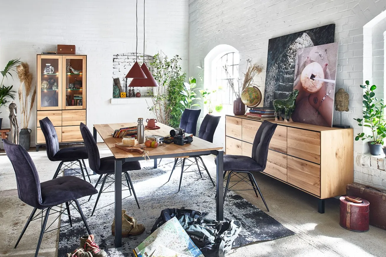 Die lackierte Oberfläche des Wildeichenholzes unterstreicht die natürliche Maserung und Textur des Holzes und verleiht der Anrichte eine glänzende Schönheit. Gleichzeitig schützt sie das Holz vor Abnutzung und erleichtert die Reinigung.