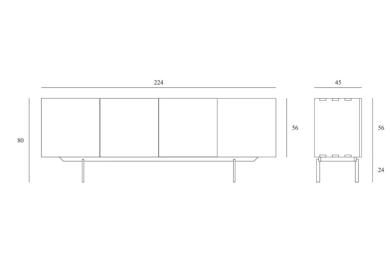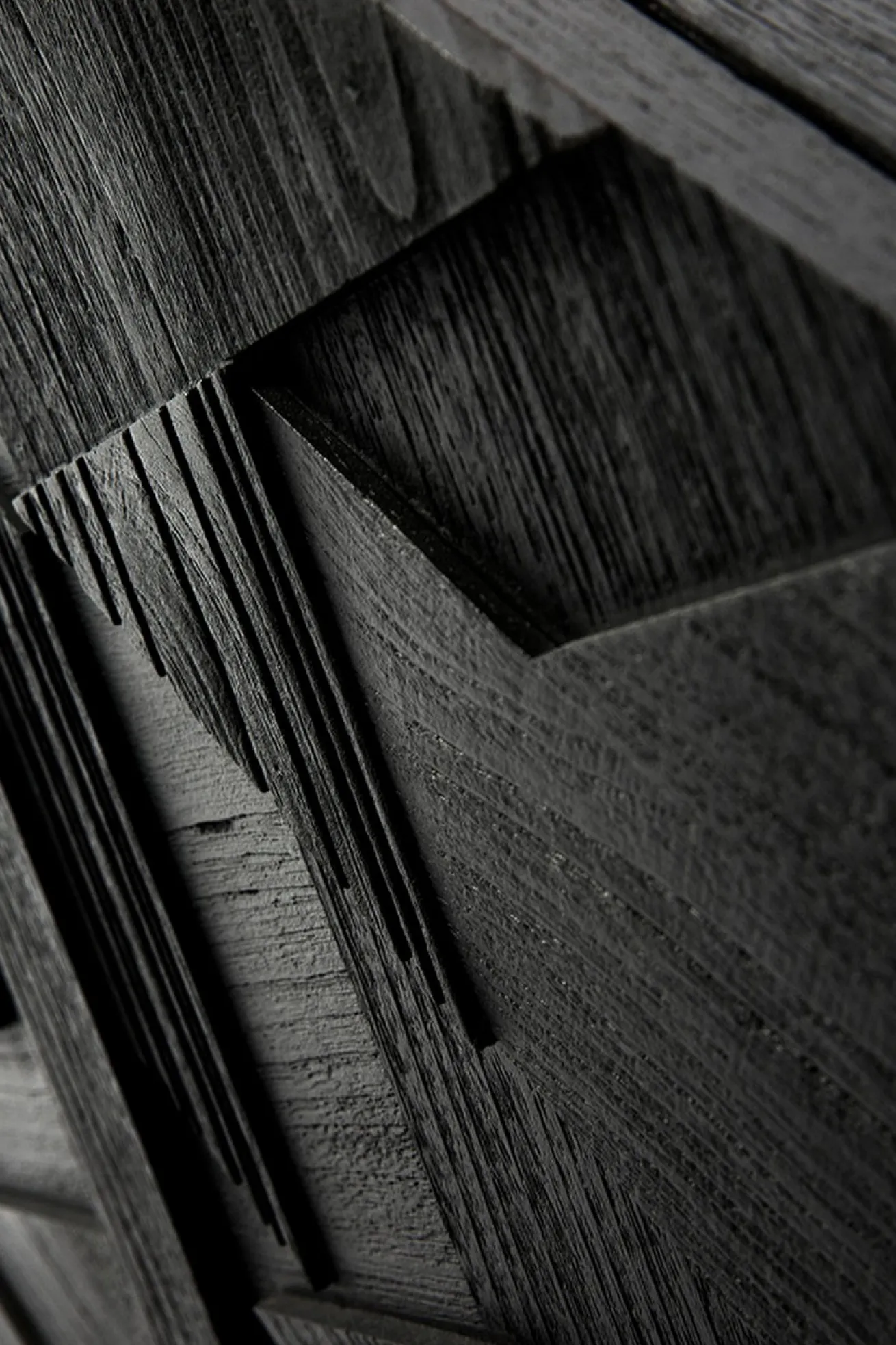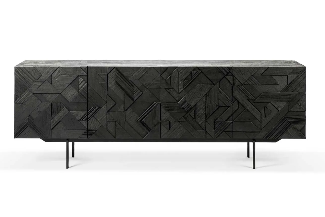 Designer Alain van Havre vereint Kreativität und mathematische Präzision in einer beispiellosen Komposition, die sich auf eine einzigartige archaische Form konzentriert. Ein Dreieck bildet die Grundlage aller Muster und wird platziert und repliziert, um etwas wirklich visuell Anziehendes zu schaffen. Durch die Verwendung mehrerer Ebenen wird ein Gefühl von Tiefe und Dynamik in der komplexen Anordnung erzeugt. Bewegung und Wärme werden hinzugefügt, indem die natürlichen Eigenschaften des Holzes weiter perfektioniert werden. Kombiniert diese unterschiedlichen und kontrastierenden Eigenschaften in einem unkonventionellen Design, das sich vom Bekannten löst und ein einzigartiges und faszinierendes Herzstück schafft. Das Graphic Sideboard besteht aus Teakholz und ist schwarz lackiert. Es hat eine Breite von 224cm, eine Höhe von 80cm und eine Tiefe von 45cm. Dank der vier filigran gearbeiteten Füße steht der Korpus des Möbelstücks im Vordergrund. Einfarbige Möbelstücke wie dieses lassen sich in Räumlichkeiten perfekt integrieren, die in neutralen Tönen eingerichtet sind und denen ein Sideboard mit viel Stauraum fehlt, sei es ein Ess- oder ein Schlafzimmer. Das Möbelstück aus Teak in schwarz ist vielseitig nutzbar.