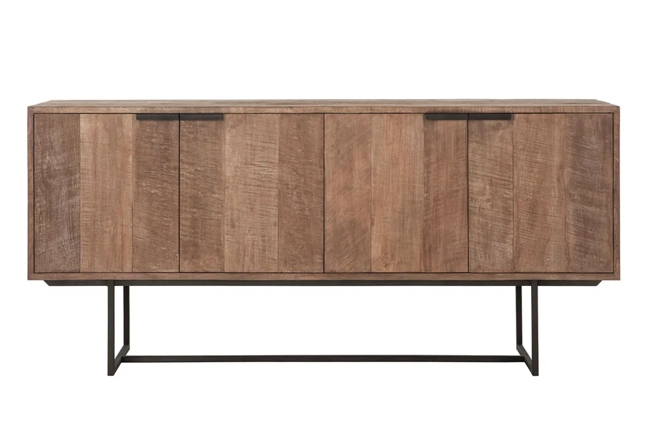 Das filigrane Metallgestell in Schwarz bildet einen faszinierenden Kontrast zur organischen Struktur des Holzkorpus. Es verleiht der Anrichte einen modernen Touch und sorgt gleichzeitig für Stabilität und Langlebigkeit. Dank der erhöhten Positionierung auf dem Gestell wirkt die Anrichte luftig und leicht, was Ihren Wohnraum optisch vergrößert und eine einladende Atmosphäre schafft.