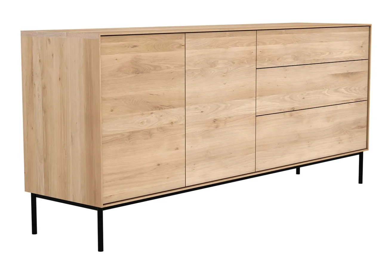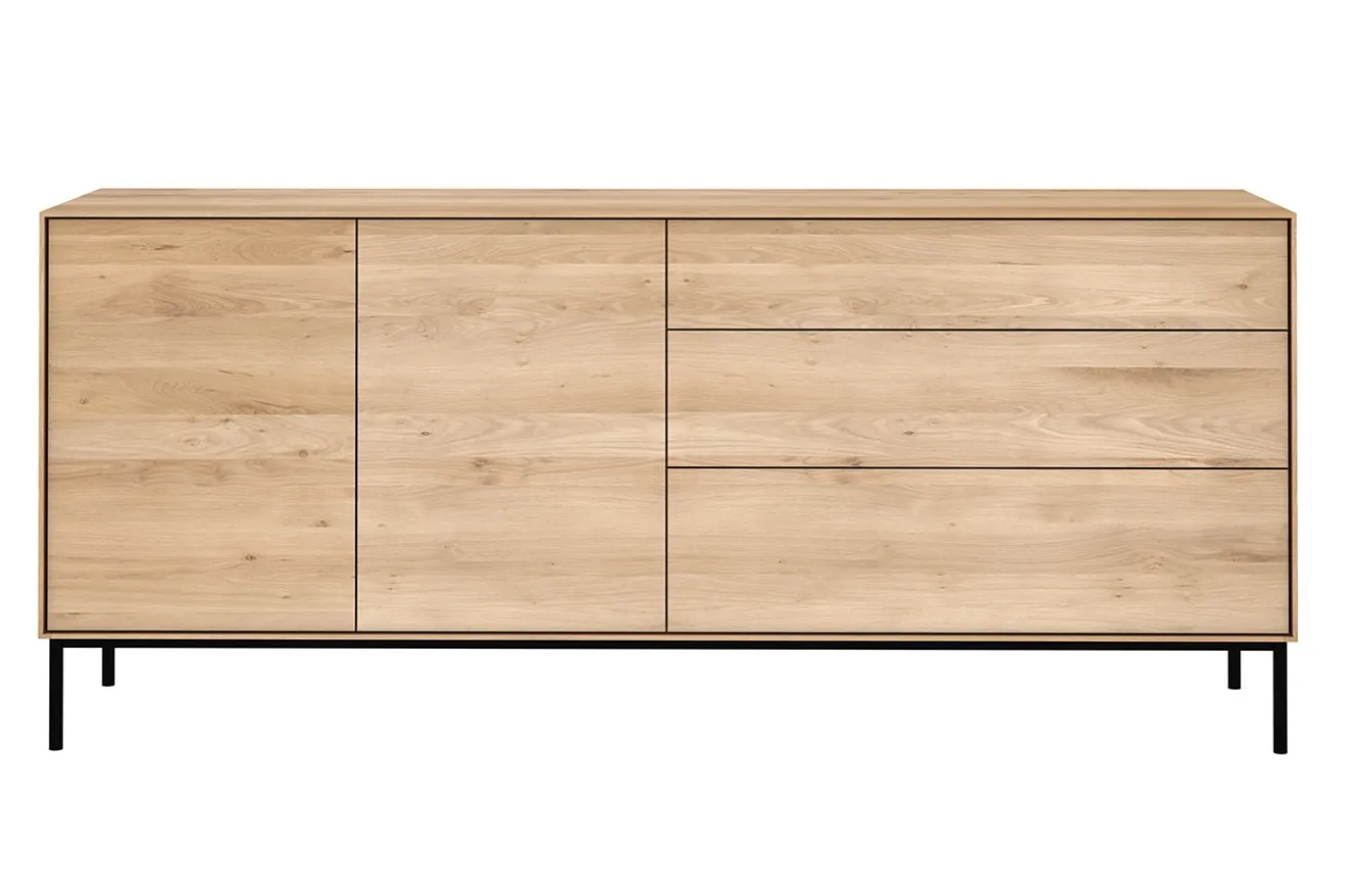 Die Kommode Whitebird besteht komplett aus massivem Eichenholz, wird aber von vier schwarzen Metallfüßen getragen. Das Möbelstück hat eine Breite von 180cm, eine Höhe von 80cm und eine Tiefe von 45cm. Die natürliche Farbe des Holzes wurde hier beibehalten. Die Oberfläche der Anrichte aus Eichenholz wurde zum Schutz geölt. Im Gesamten besteht das Sideboard aus 2 Türen und 3 Schubladen. Das moderne Möbelstück lässt sich nicht wie andere Schränke durch Griffe öffnen, sondern durch das Greifen der Türrahmen.