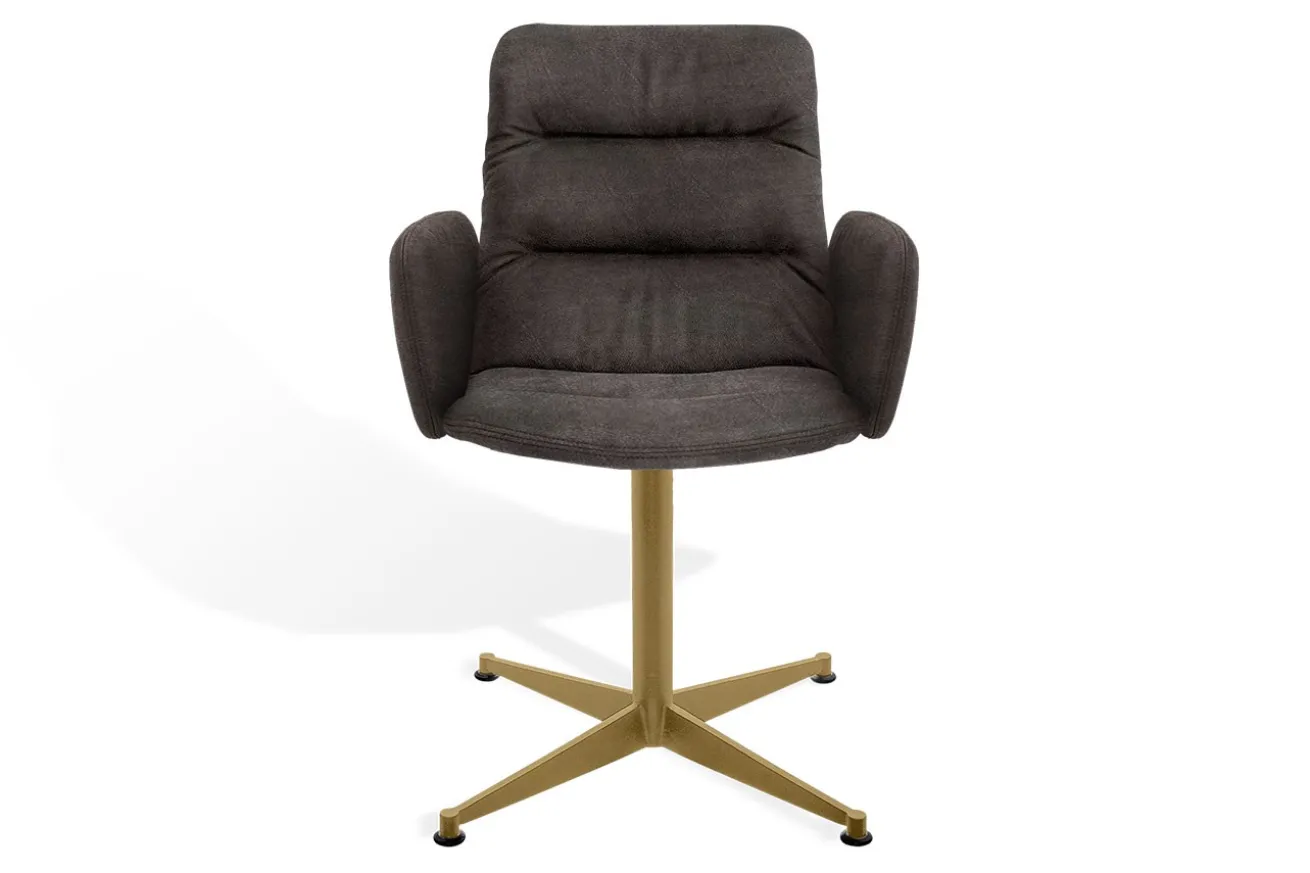 Das messingfarbene Sterngestell mit vier stabilen Füßen verleiht dem Stuhl einen luxuriösen Touch und sorgt gleichzeitig für sicheren Stand und maximale Stabilität. Die Drehfunktion macht ihn besonders flexibel und ermöglicht ein leichtes Hinwenden zu Gesprächspartnern oder Bequemlichkeit im Alltag.