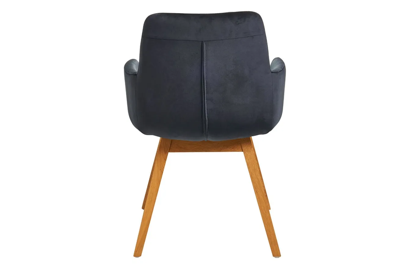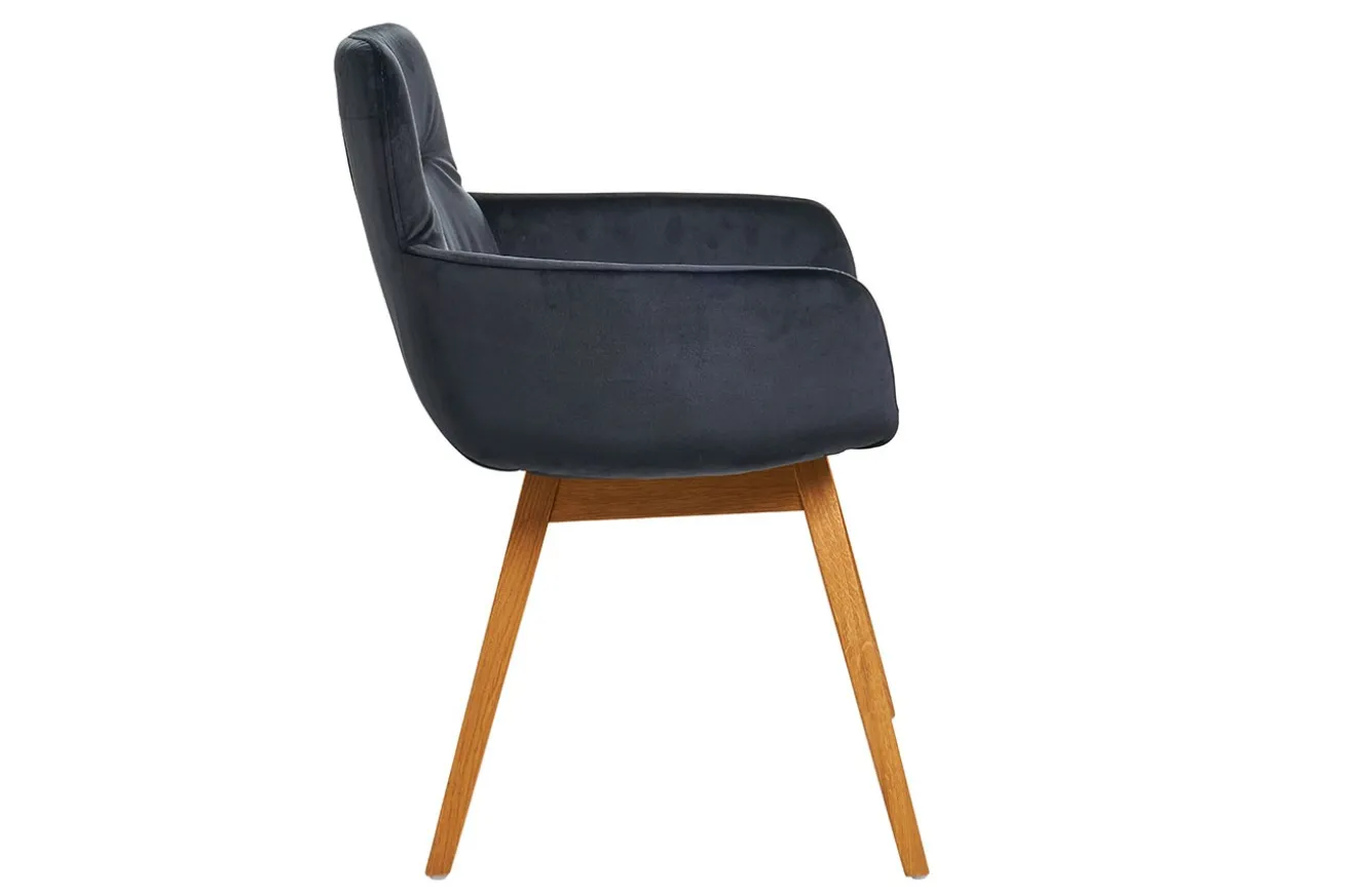 Die Holzfüße in natürlicher Farbe setzen nicht nur einen warmen Akzent, sondern unterstreichen auch die hochwertige Verarbeitung des Stuhls. Die klare Linienführung und die geschwungenen Armlehnen verleihen dem Möbelstück eine zeitgemäße Note, während die Holzfüße für Stabilität und einen Hauch von Natürlichkeit sorgen.