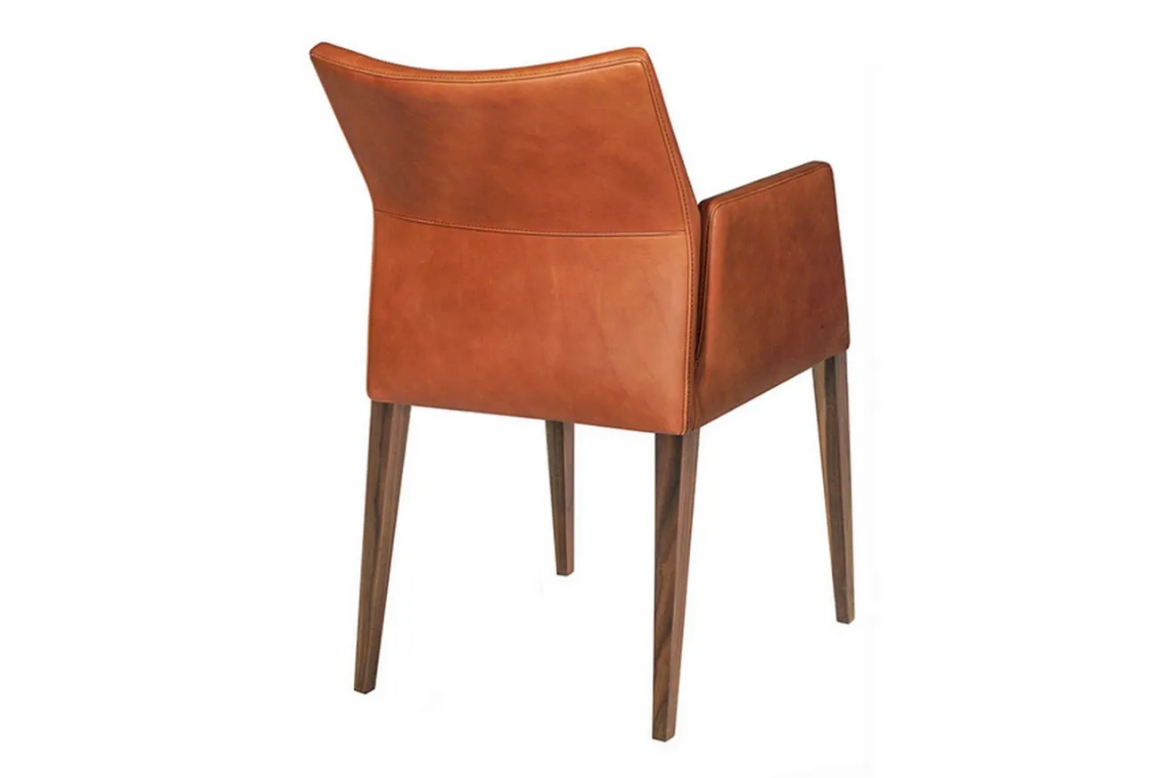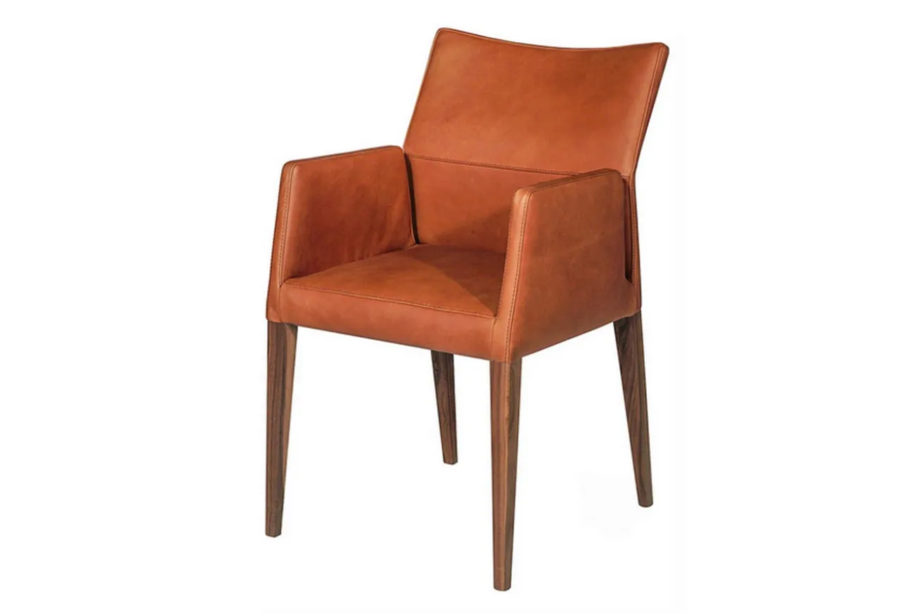 Zeitlos elegant ist Lenny, der Küchenstuhl. Das Sitzmöbel für Küche und Esszimmer überzeugt durch seine Symbiose aus braunem Leder und dunkelbraunen Holzfüßen. Entspanntes Zurücklehnen ist mit Lenny möglich: Ein gemütlicher Korpus mit Lederummantelung und Armlehnen sorgt für eine gemütliche Atmosphäre am Esstisch. Die ohnehin ausgestrahlte Wertigkeit des Leders wird durch die dunklen Holzfüße, die den Korpus tragen, unterstrichen. Leder-Lenny ist ein moderner Armlehnstuhl, der auch in Küchen im Vintage-Stil nicht fehlen darf.