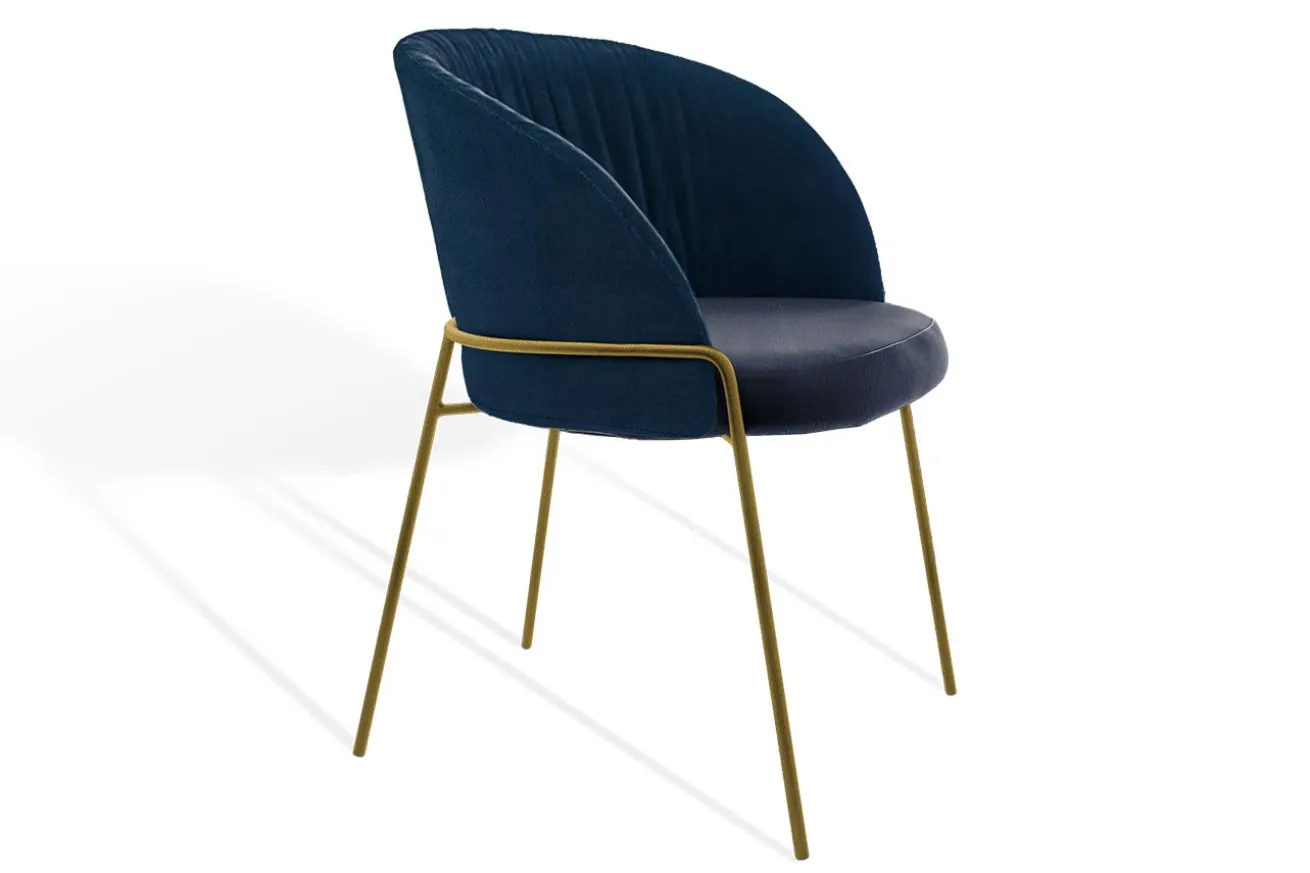 Das goldfarbene Metallgestell mit seinen filigranen, aber stabilen Beinen schafft einen harmonischen Kontrast zu den kühlen Blau-Nuancen und verleiht dem Stuhl eine warme und zugleich moderne Note. Die integrierten Armlehnen, ebenfalls elegant in das Gestell eingefasst, bieten angenehme Unterstützung, ohne die Leichtigkeit des Designs zu beeinträchtigen.