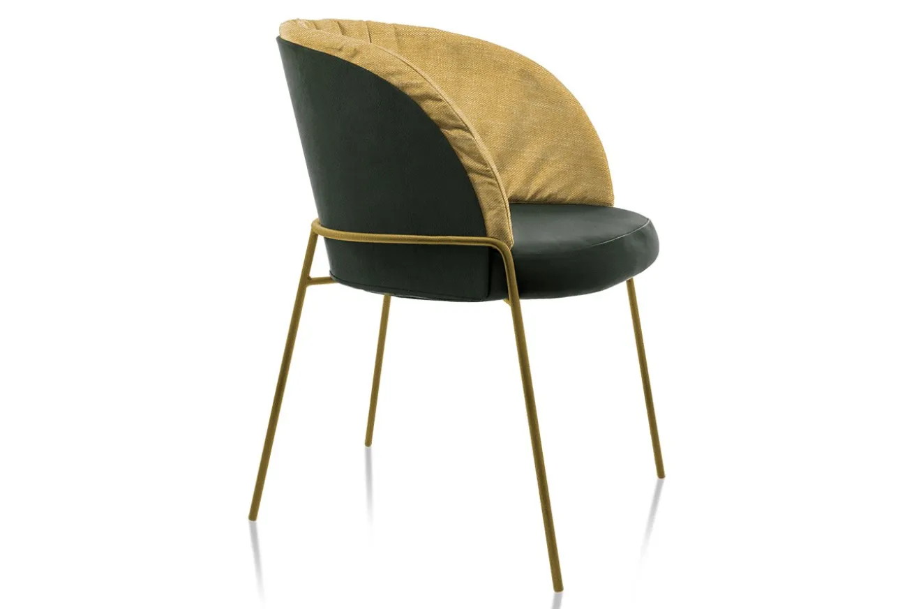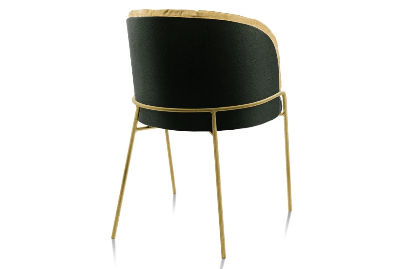Dieser Armlehnstuhl verbindet luxuriöse Materialien mit einem außergewöhnlichen Design und setzt in jedem Raum stilvolle Akzente. Die Sitzschale, gefertigt aus edlem grünem Leder, strahlt nicht nur Eleganz aus, sondern bietet auch einen angenehm weichen Sitzkomfort. Der kräftige Grünton verleiht dem Stuhl eine moderne Frische, die sich wunderbar mit dem goldgelben Rückenkissen ergänzt. Dieses Kissen, aus hochwertigem Stoff gefertigt, sorgt für zusätzlichen Komfort und bildet gleichzeitig einen lebendigen Farbakzent, der dem Gesamtbild eine warme, einladende Note verleiht.