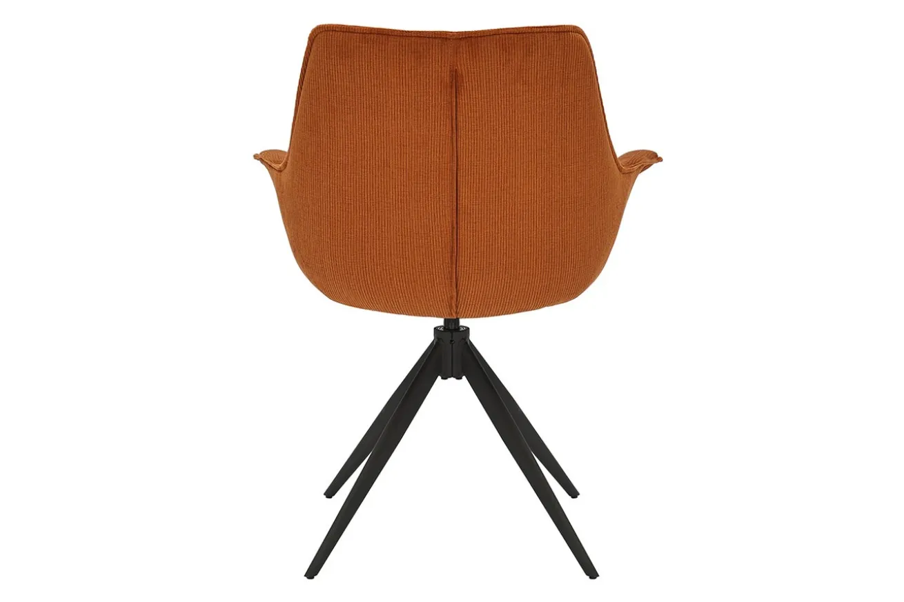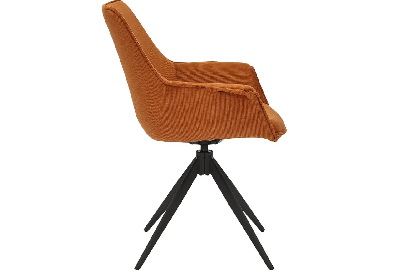 Dank der Drehfunktion bietet der Stuhl flexible Beweglichkeit – ideal am Esstisch oder im Homeoffice. Die komfortabel gepolsterten Armlehnen und die ergonomisch geformte Sitzschale laden zum Verweilen ein. Das schwarze Metallgestell in Kreuzform sorgt für Stabilität und einen modernen Kontrast.