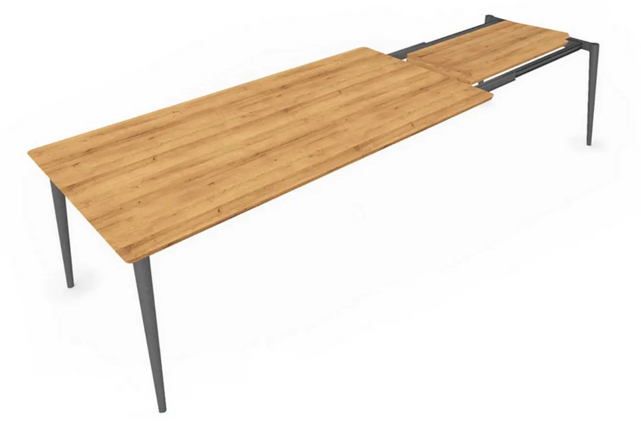 Der Ausziehtisch „Cora“ besteht aus hochqualitativem Massivholz, nämlich Eiche. Er hat die Maße Breite 160-260cm, da sich die Platte ausziehen lässt, eine Tiefe von 90cm, eine Höhe von 76cm sowie eine Stärke von 2,4cm. Obwohl Eichenholz für seine Härte und Widerstandsfähigkeit bekannt ist, sieht das hier nicht so aus, da die Platte relativ dünn erscheint. Die Oberfläche des im Hausbaus sehr begehrten Holzes ist naturbelassen, weist eine schweizer Kante auf, wodurch die Kantenstärke nicht direkt erkennbar ist und zeichnet sich durch abgerundete Ecken aus. Wenn Sie das Massivholzmöbel ausziehen möchten, benötigen Sie ein relativ großes Esszimmer, damit der Tisch genug Platz hat, um alle Gäste an ihm sitzen zu lassen, ohne sich vorbei zu quetschen. Getragen wird das Produkt von vier schwarzen Metallbeinen, wodurch die Rustikalität der Holzart zwar unterstrichen wird, der Tisch aber etwas moderner erscheint. Dennoch wird so die natürlich-warme Farbgebung mit den Maserungen, die dazugehören, unterstrichen.