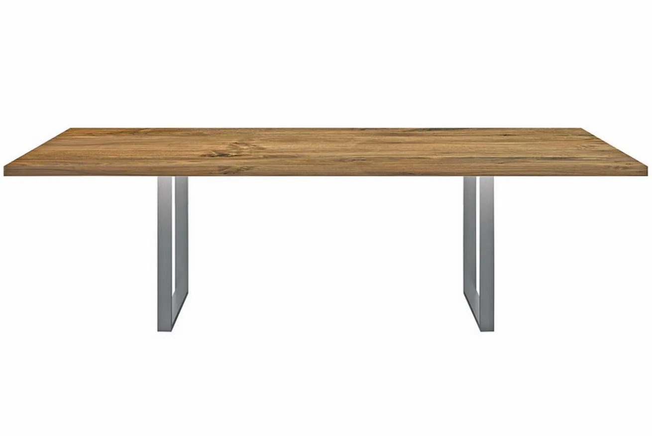 Auch wenn unser Tisch „Knud“ heißt, hat er nichts mit dem berühmten Eisbären zu tun, denn er hat weder Fell und ist auch nicht süß. Dafür aber schwer und praktisch. Er besteht nämlich aus dem harten und schweren Holz der Kernbuche. Das Massivholzmöbel hat eine Breite von 140-190cm, da es ausziehbar ist, eine Tiefe von 100cm und eine Höhe von 76cm. Die gleichmäßige Maserung, für die Buchenholz bekannt ist, ist samt ihren Ästen als Tischplatte in ihrer Naturfarbe vorhanden. Die Oberfläche wurde geölt. Der Esszimmertisch kann allerdings nur als jenes Möbelstück dienen, wenn es auch auf Tischfüßen steht, ist ja essentiell für einen Tisch. Hier steht die Massivholzplatte auf zwei u-förmigen Füßen aus geschliffenem Edelstahl. Ein moderner Tisch, der dank seiner Fähigkeit zum Verlängern der Platte noch besonderer ist, als unsere Tische ohnehin schon sind, sieht gerne viele Gäste bei sich an der geraden Tischkante sitzen.