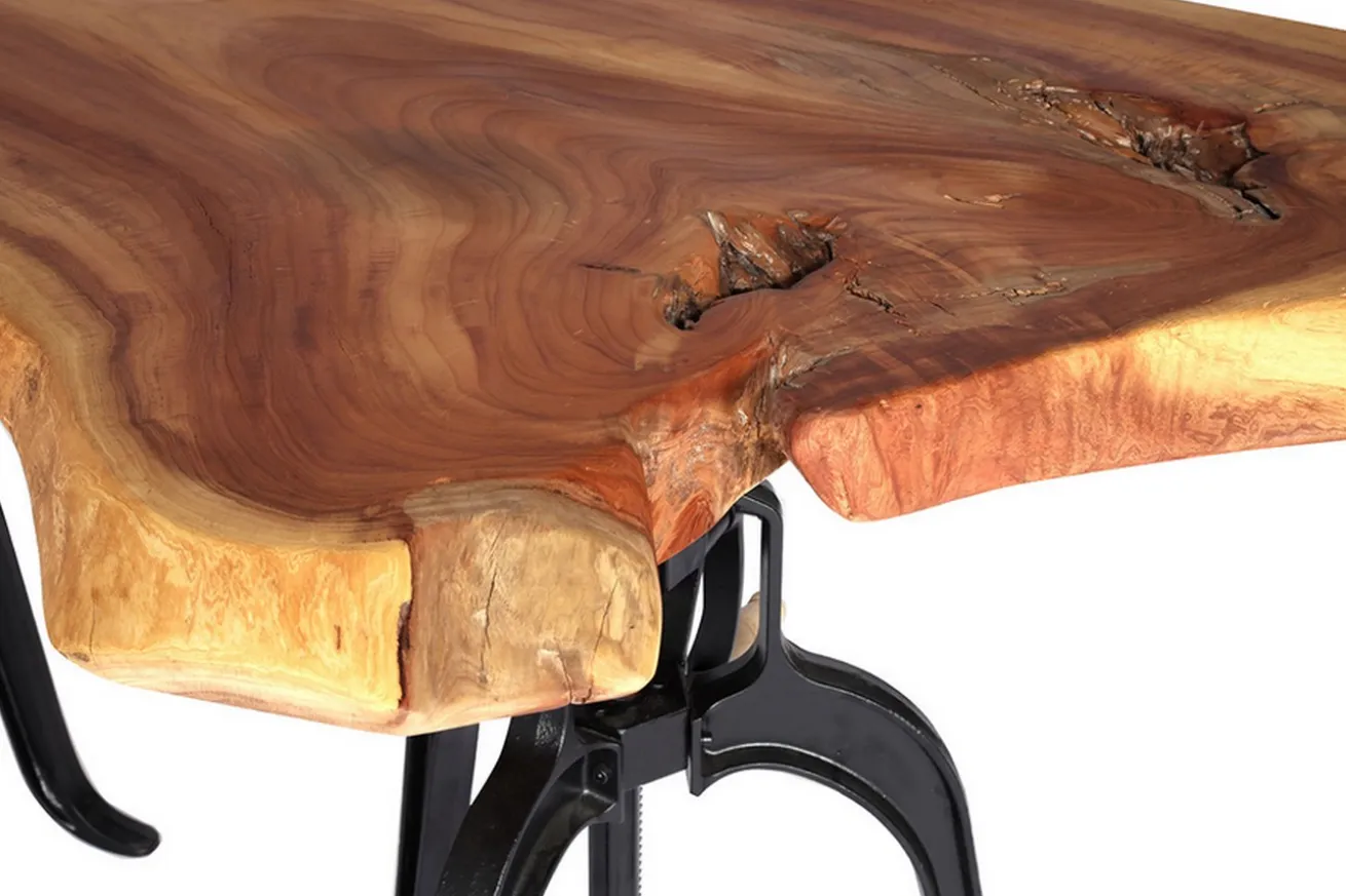 Industrial-Stil ist angesagt bei unserem Tisch „Hennry“ aus Mangoholz! Der Tisch hat eine monolithische Platte, was bedeutet, dass die Fläche in einem Stück vom Baumstamm getrennt wurde. Getragen wird diese von zwei aus schwarzem Gusseisen bestehenden Füßen im eleganten Stil, die mit ihrer Kurbel an eine Nudelwalze oder Nähmaschine erinnern. Hier dient der Griff jedoch, um den Tisch in der Höhe zu verstellen. Mit den Maßen Breite 190cm, Höhe 4-6cm, Tiefe 76-112cm und einer Stärke von 6cm nähert sich die Platte einer Speisetafel, die nicht nur im Esszimmer oder als Küchentisch, sondern vor allem als Tisch in einer Bar ein absoluter Hingucker wird. Die Massivholzplatte zeichnet sich duch eine außergewöhnliche Farbgebung mit wohnlich-warmer Note aus und wirkt sehr elegant. Die Oberfläche unseres Prodktes wurde geölt, um impregniert zu werden. Durch sein sehr modernes, loftiges Aussehen lässt sich der Tisch problemlos mit schwarzen Stühlen oder kleinen Barhockern kombinieren, die dem Pub-Feeling etwas Gutes tun. Eine Flasche alten Whiskey in einer Kristallkaraffe als Dekoration und schon ist der Tisch perfekt.