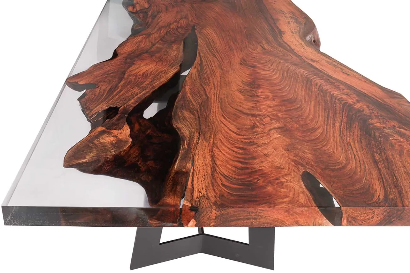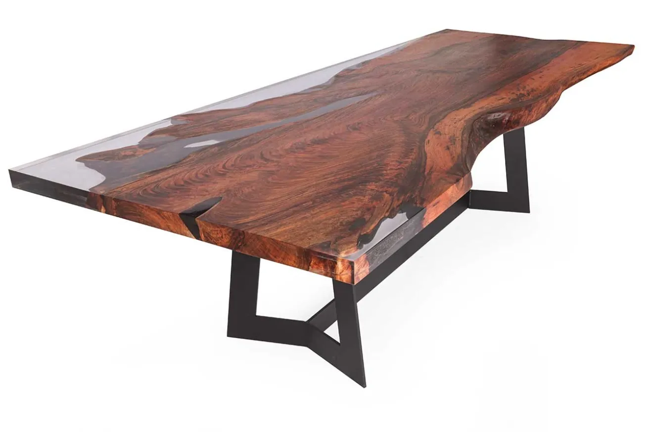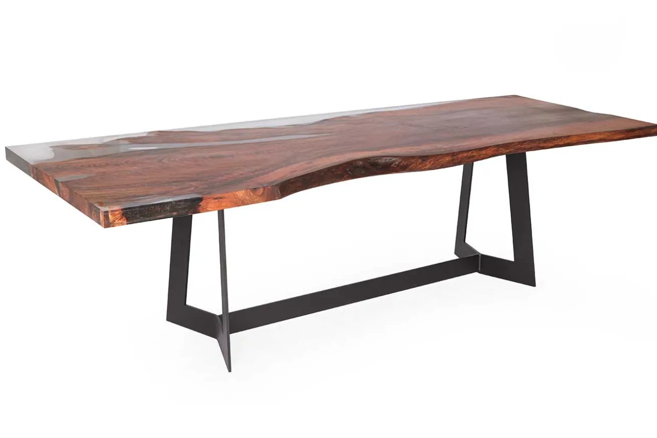 Mit den passenden, dunklen Designstühlen lädt sie zum abendlichen Dinner ein. Denn wo sonst möchte man länger verweilen als an einem wunderschönen, ausgefallenen Tisch, der mehr als nur ein Massivholzmöbelprodukt ist?
