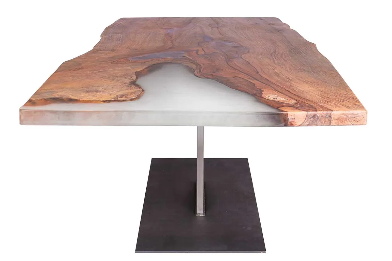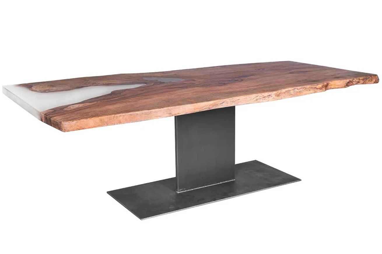 Dieser einzigartige Konferenztisch ist aus dem Massivholz Mango mit einer organischen Kante und Form. Dieses Holz zeichnet sich durch seine außergewöhnliche Farbe aus, die jedem Raum eine wohnlich-warme Note sowie ein elegantes Design verleiht. Die Oberfläche hier wurde geölt und der von Natur aus gegebene Riss mit einer mattweißen Epoxidharzverfüllung geschlossen. Dadurch erhalten Sie einen ganzen Tisch mit einem besonderen Aussehen. Die Platte hat die Maße Breite 294cm, Tiefe 107-115cm und eine Stärke von 6cm. Die Höhe von 78cm erschließt sich aus der Kombination von Tischplatte und -Bein. Dieses besteht aus einem anthrazitfarbenen Stahlbein, das mittig angebracht wurde. Mit seiner imposanten Breite eignet sich der Tisch vor allem in ein großes Esszimmer, der sich auch Speisesaal nennen darf und genügend Platz für große Feiern und mehrgängie Dinner bietet.