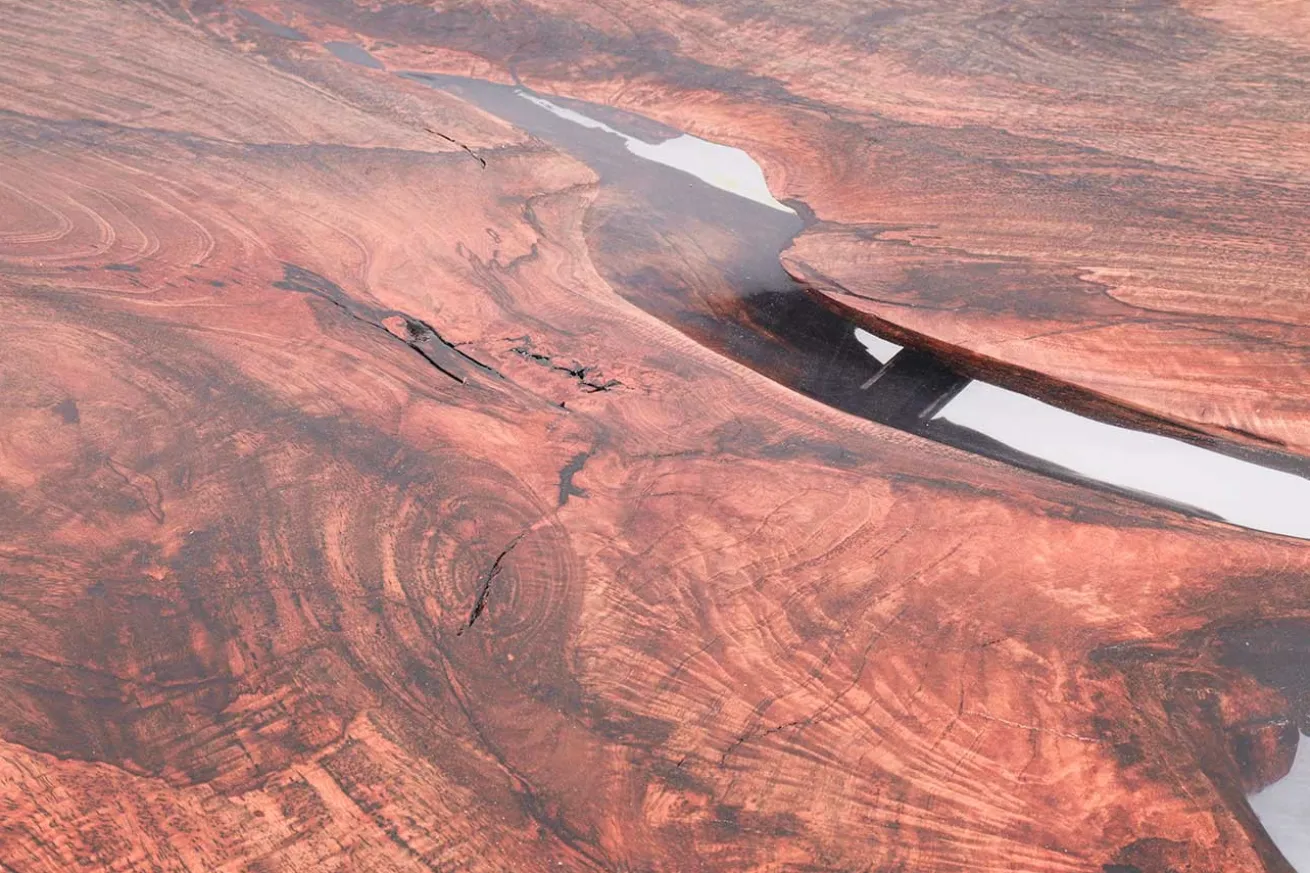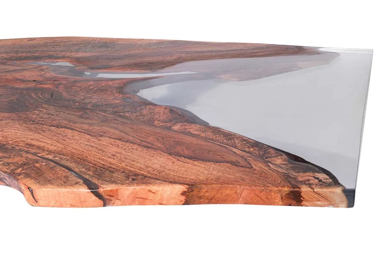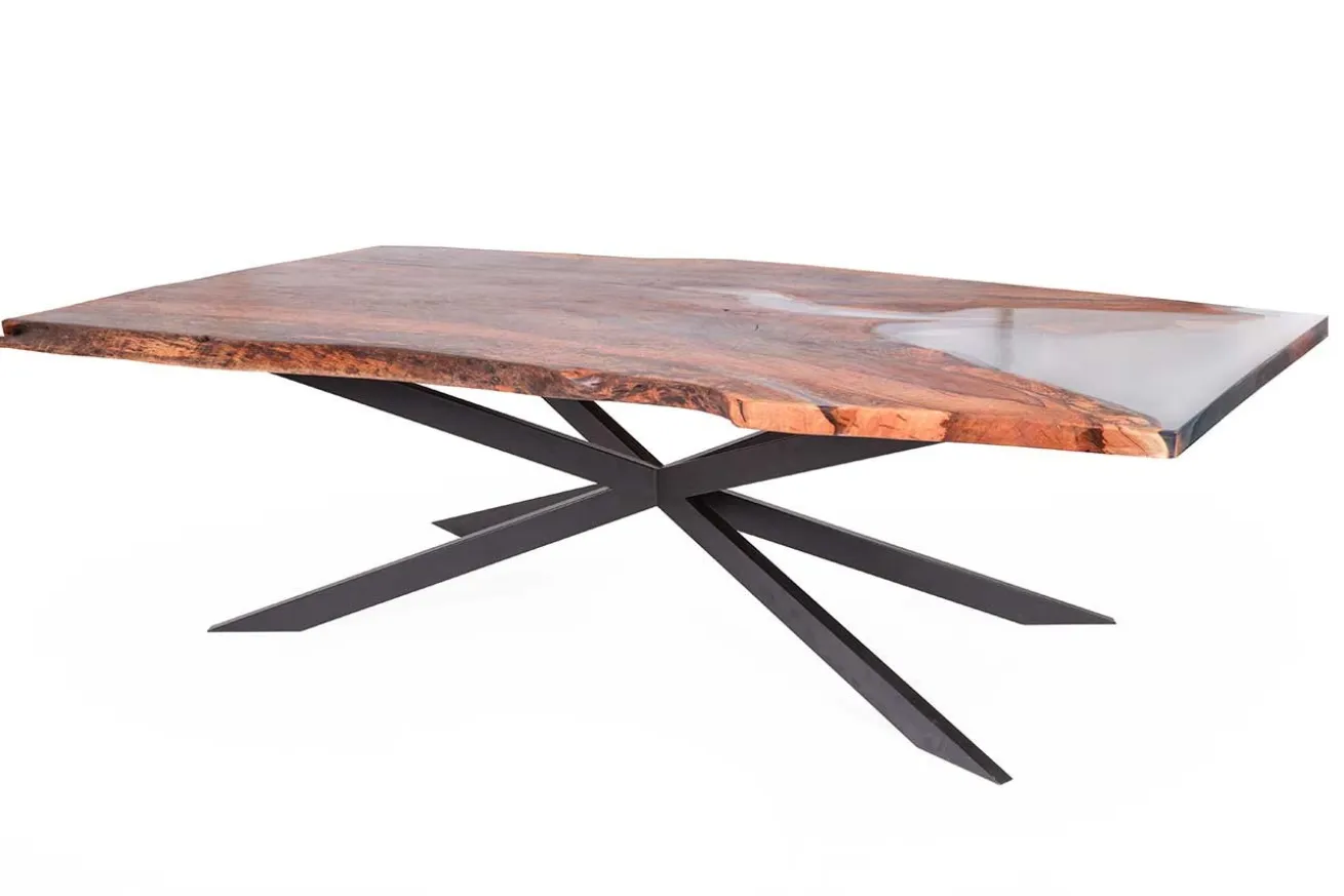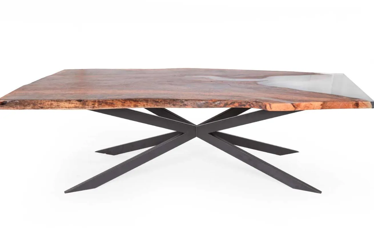 Einzigartiger Charaktertisch aus einer massivem Mangoholzbaumscheibe. Die 265 cm lange und 6 cm dicke Massivholzplatte ruht auf einem stabilen schwarzen Stahluntergestell in Sternform. Die Tischplatte wurde aufwändig mit klarem Epoxi verfüllt und ist somit zum Teil transparent. Ein ganz besonderer Hingucker in Ihrem Büro oder ihrem Esszimmer. Kombinieren Sie Monolith mit dunklen Lederstühlen oder gepolsterten Armlehnstühlen aus weichem Samt in den buntesten Farben und spielen Sie mit den vielfältigen Einrichtungsmöglichkeiten rund um den Massivholztisch.