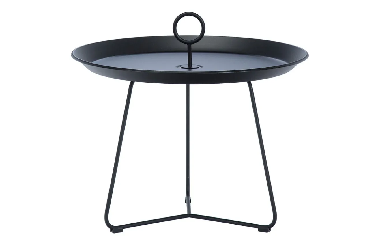 Wie eine Etagére sieht der Beisteller, der auch drinnen als auch Nachttisch dienen kann, aus. Es spricht auch wirklich nichts dagegen, (un)gesunde Snacks auf Porzellantellern hinzustellen und nach ihnen zu greifen, Wenn Sie in Ihr neues Buch vertieft sind. Immerhin bietet Eyelet mit einem Durchmesser von 60cm und einer Höhe von 41cm genügend Platz dafür. Der schwarz pulverbeschichtete Beistelltisch mit Griff in der Mitte lässt sich aber auch mit den passenden Accessoires dekorieren. Ob Sie das Möbelstück nun drinnen oder draußen verwenden, liegt ganz an Ihnen. Eins sollten Sie jedoch wissen: der integrierte Wasserablauf sorgt dafür, dass Regenwasser problemlos durchlaufen kann.