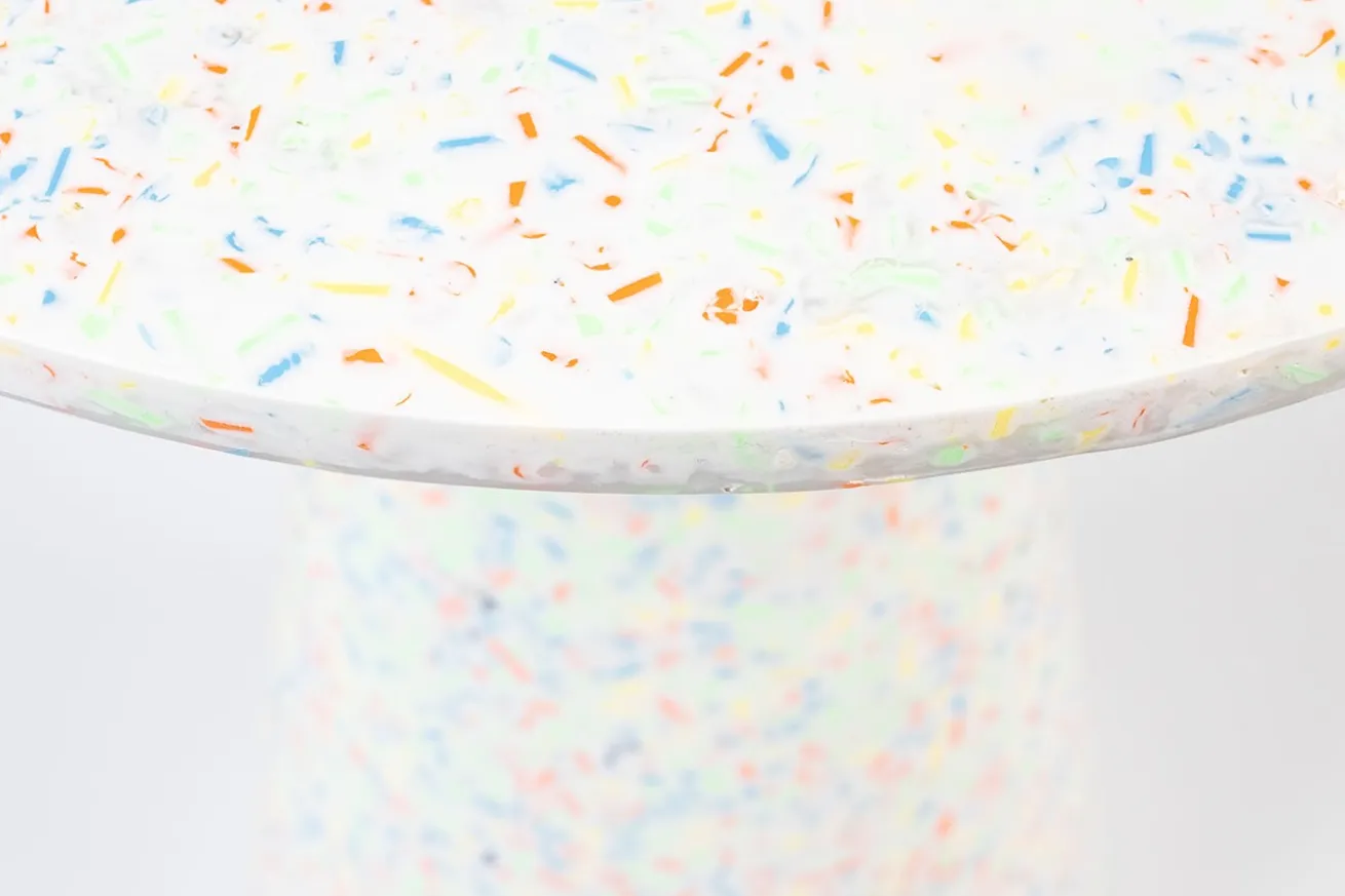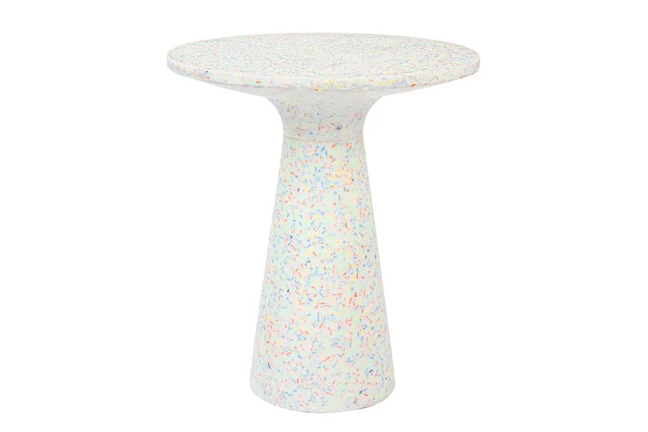 Der Beistelltisch Vicky von Zuiver bringt frischen Wind in Ihr Zuhause – und das auf besonders umweltfreundliche Weise. Gefertigt aus recyceltem Kunststoff, punktet Vicky nicht nur mit robuster Qualität, sondern auch mit einer spannenden Optik: Die bunten Einschlüsse aus Spielzeugresten verleihen dem Tisch seinen einzigartigen „Disco-Dip“-Look.